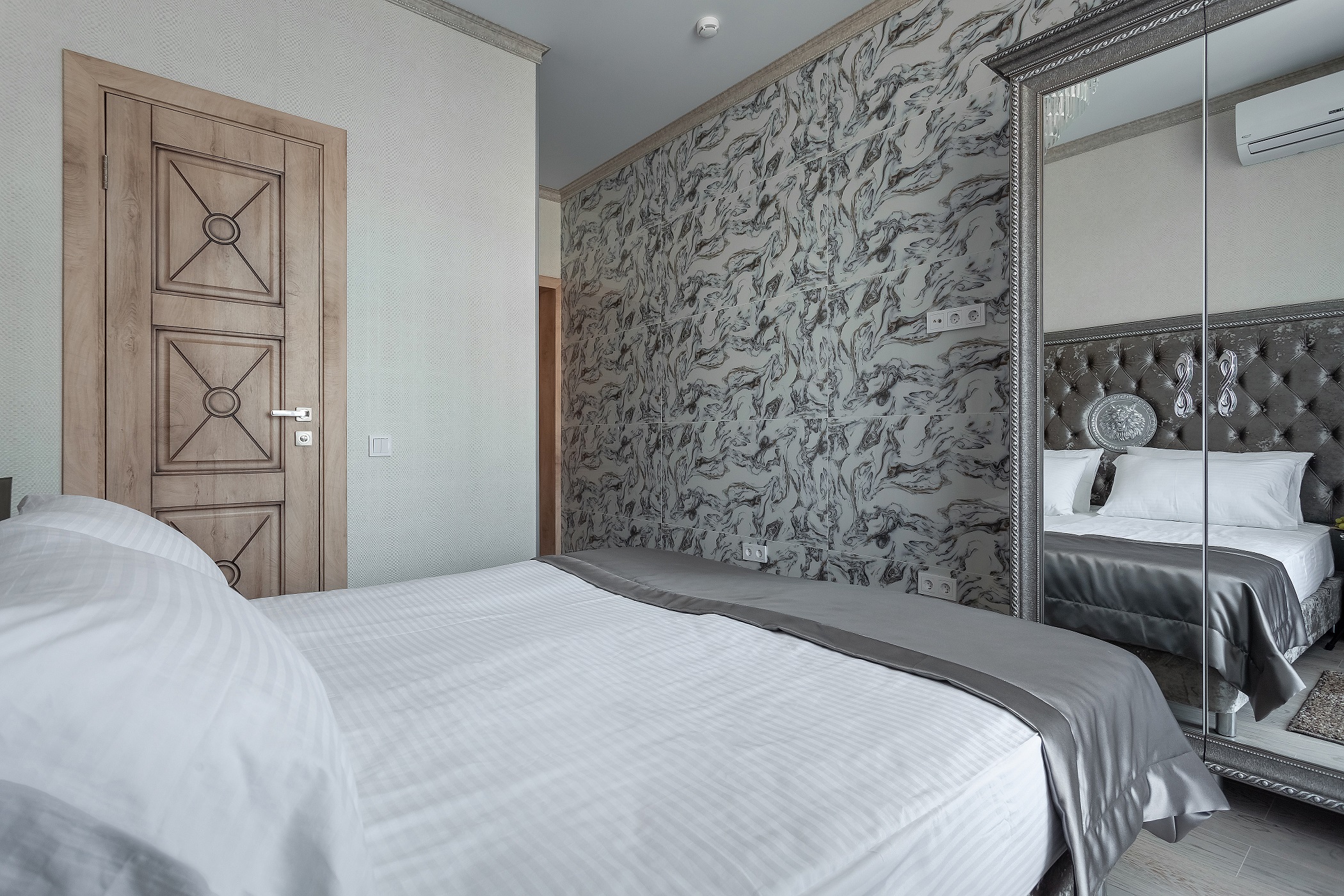 вешалка, зеркало, кресло-кровать, кровати односпальные /одна двуспальная кровать, прикроватные тумбочки, стол, шкаф