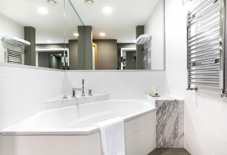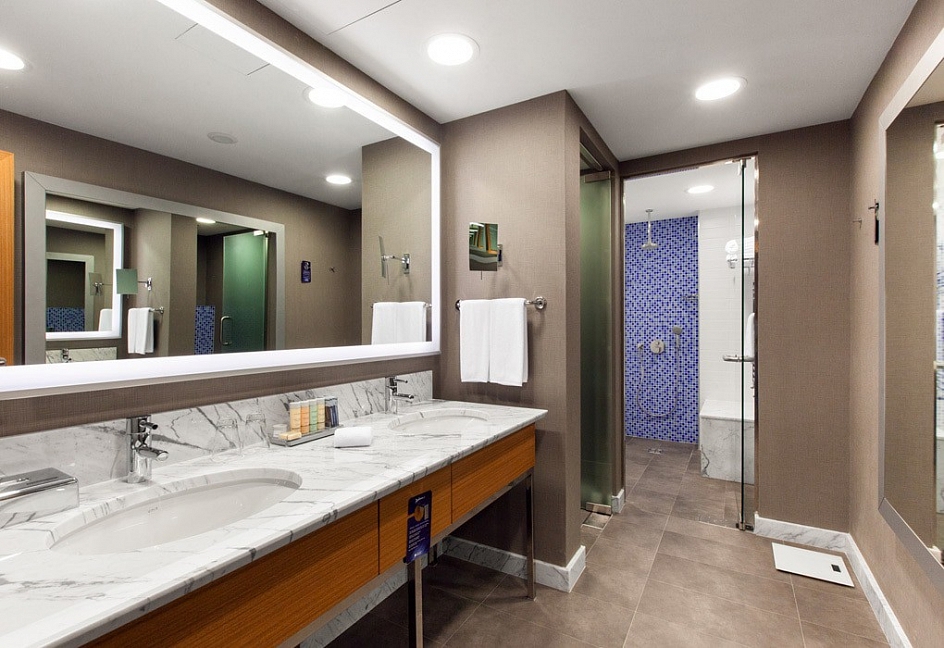 с ванной и душевой кабиной, тапочки, туалетные принадлежности, фен, халат