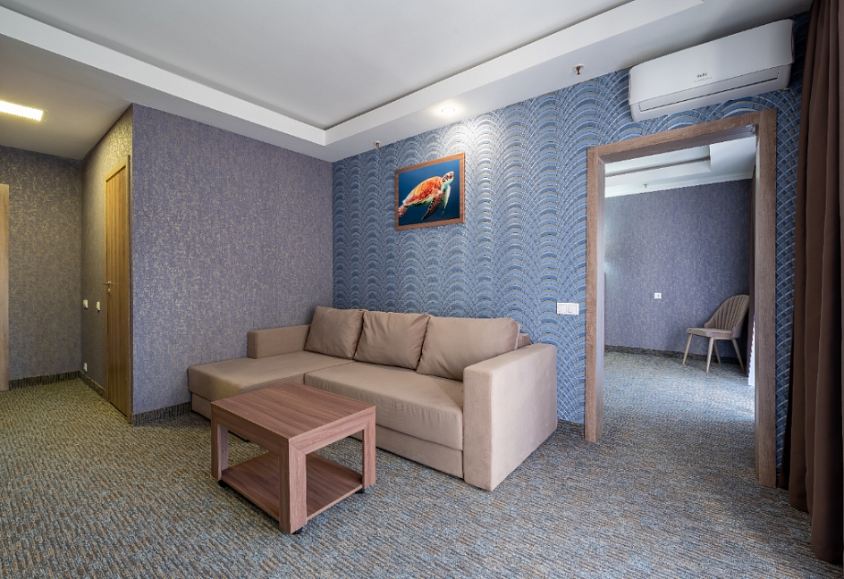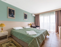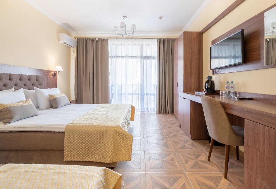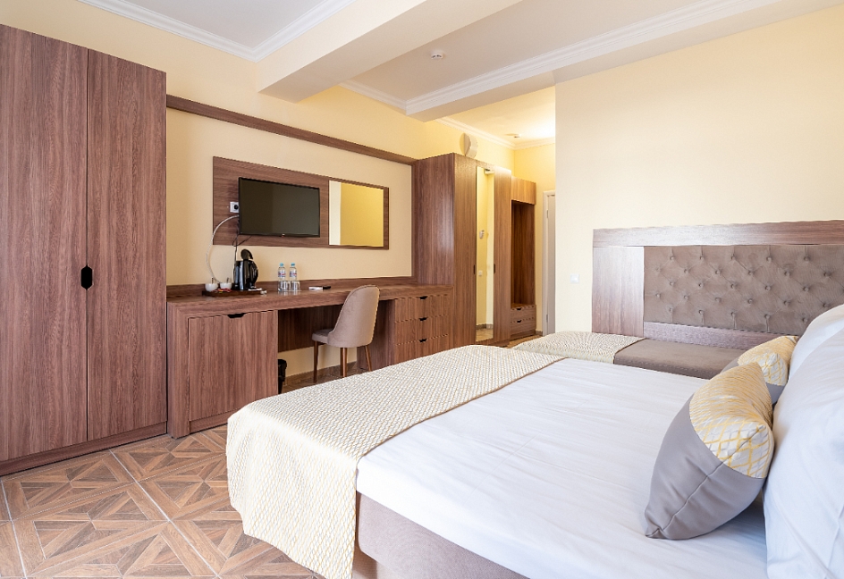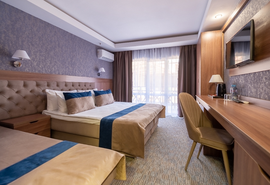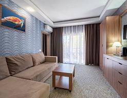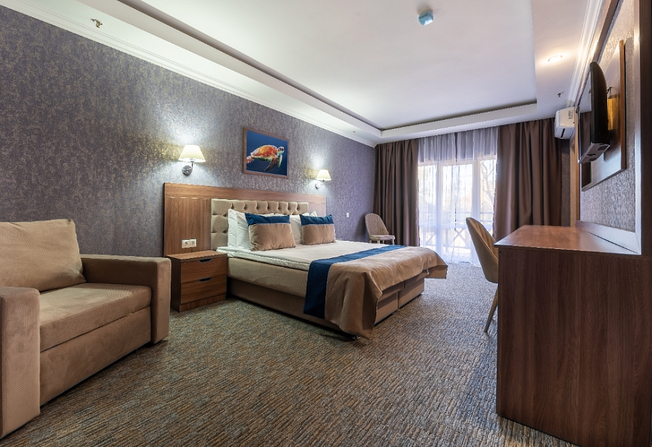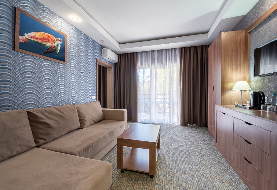 Современные и уютные номера: Номера комплекса предоставляют все необходимое для комфортного проживания, а также частичный или полный вид на море, создавая атмосферу уюта и спокойствия.