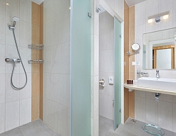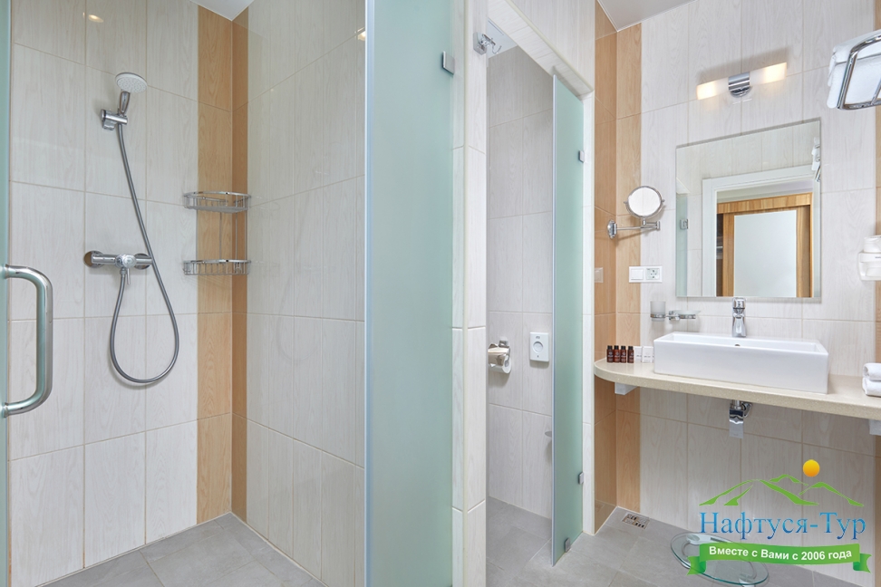 с душевой кабиной, тапочки, туалетные принадлежности, фен, халат