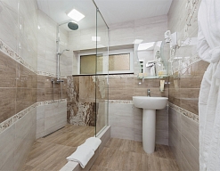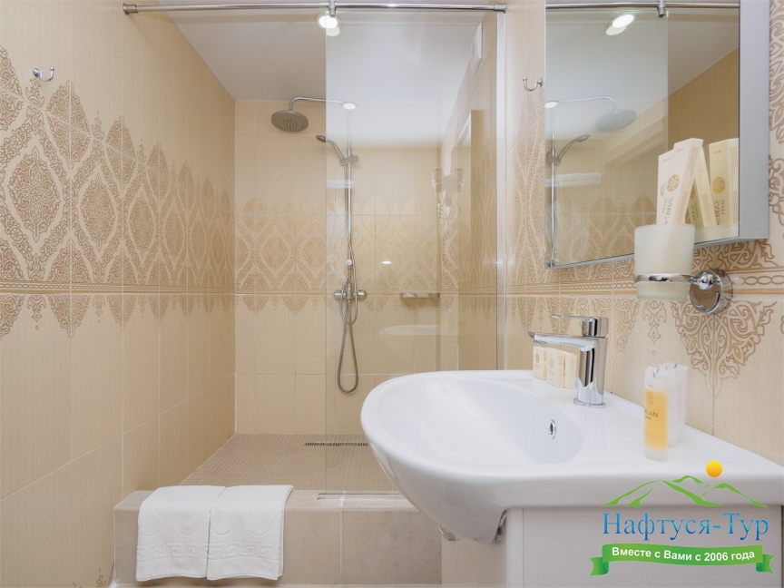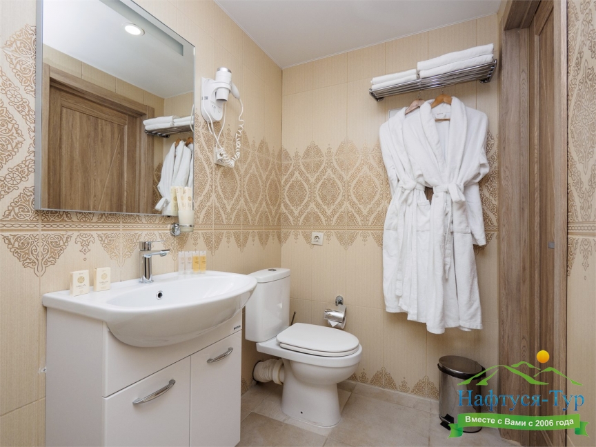 с душем, тапочки, туалетные принадлежности, фен, халат
