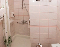 биде, с ванной и душевой кабиной, тапочки, туалетные принадлежности, фен, халат