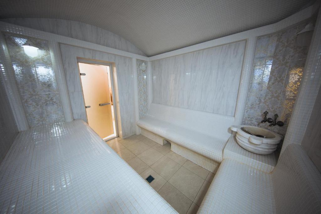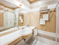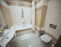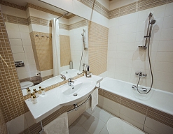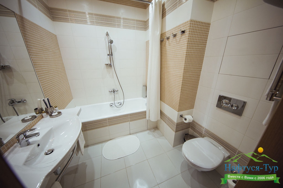 с душем или ванной, тапочки, туалетные принадлежности, фен, халат