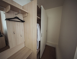 вешалка, зеркало, кровати односпальные /одна двуспальная кровать, прикроватные тумбочки, стол, стулья, шкаф