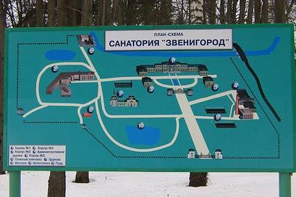 - На автомобиле: по Можайскому шоссе до г. Голицыно, указатель на г. Звенигород направо (на малое бетонное кольцо), далее примерно 12 км, проезжаете ж/д станцию Звенигород и по указателю на санаторий "Звенигород" - налево, через 50 м справа центральные ворота санатория.
