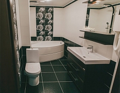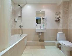 с ванной, тапочки, туалетные принадлежности, фен