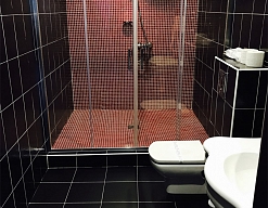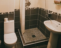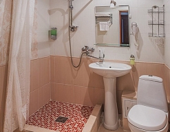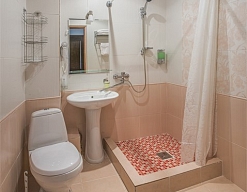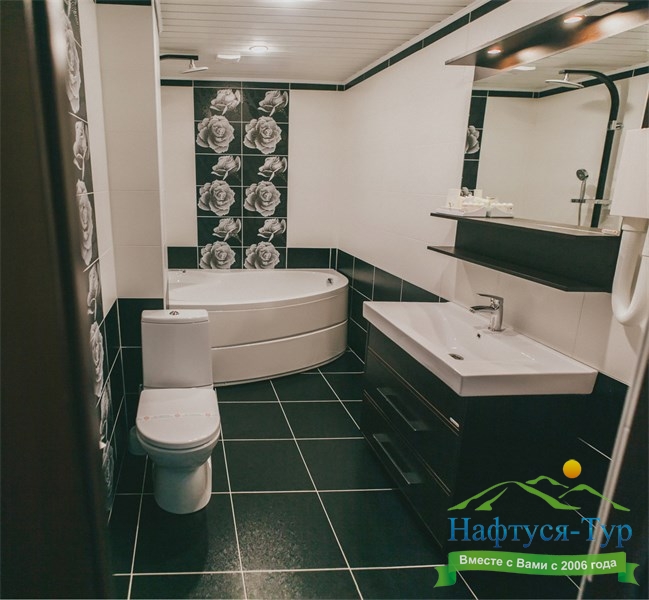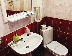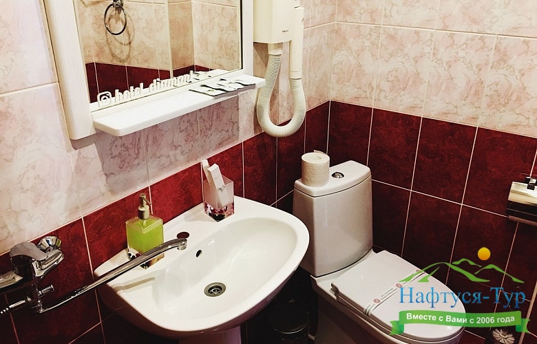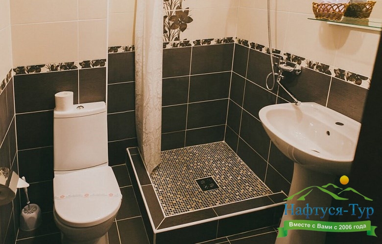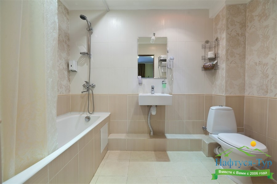 с душем или ванной, тапочки, туалетные принадлежности, фен