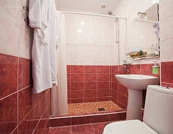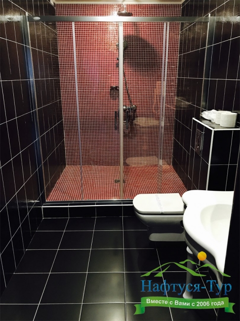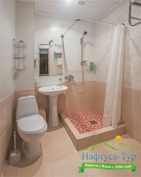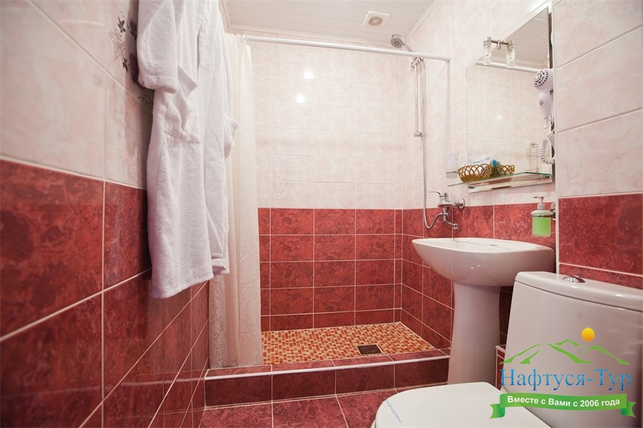 с душем, тапочки, туалетные принадлежности, фен, халат
