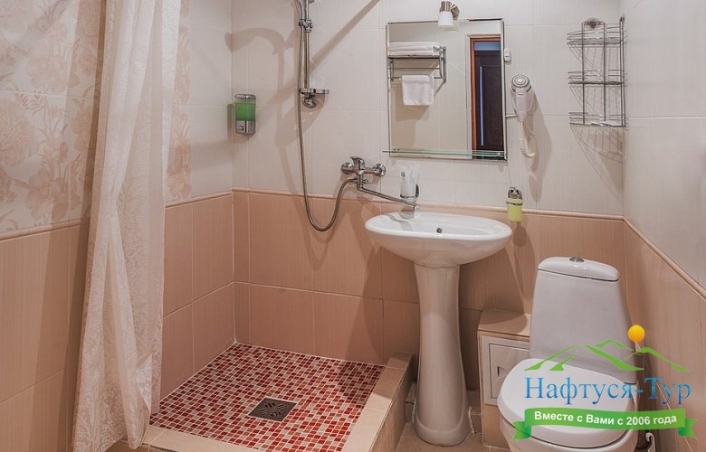 с душем, тапочки, туалетные принадлежности, фен