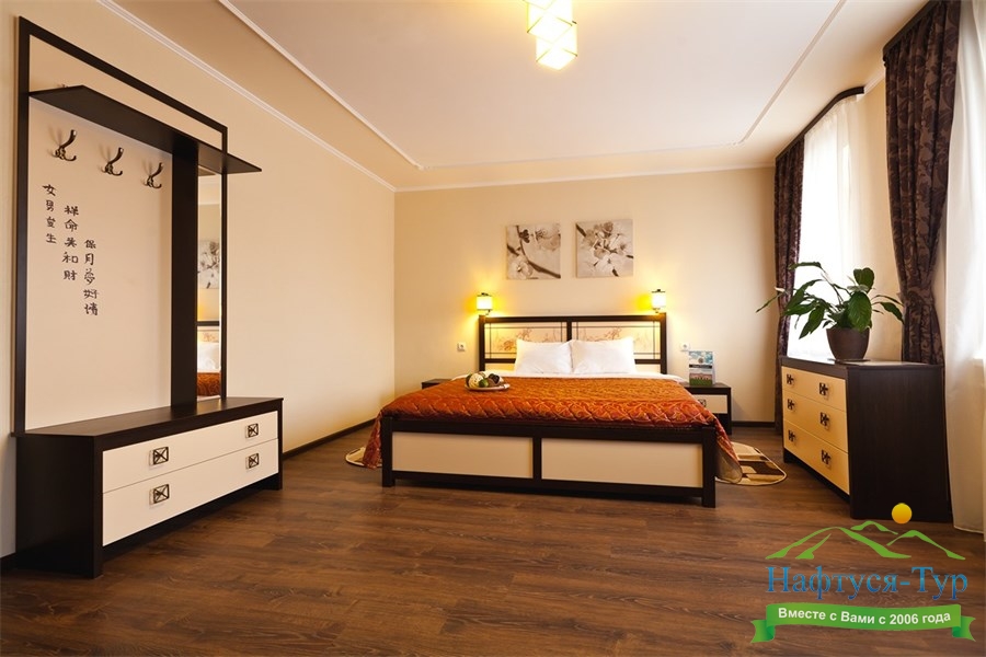 вешалка, зеркало, комод, кресла, кровать двуспальная, прикроватные тумбочки, стол, шкаф
