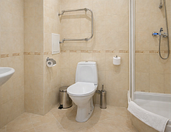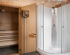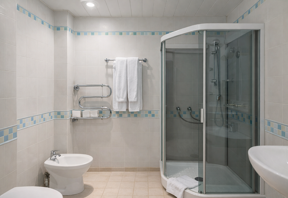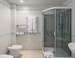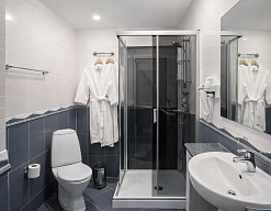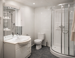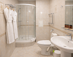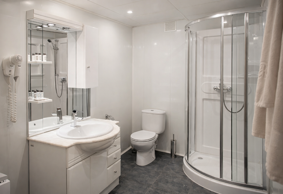 с душевой кабиной, туалетные принадлежности, фен