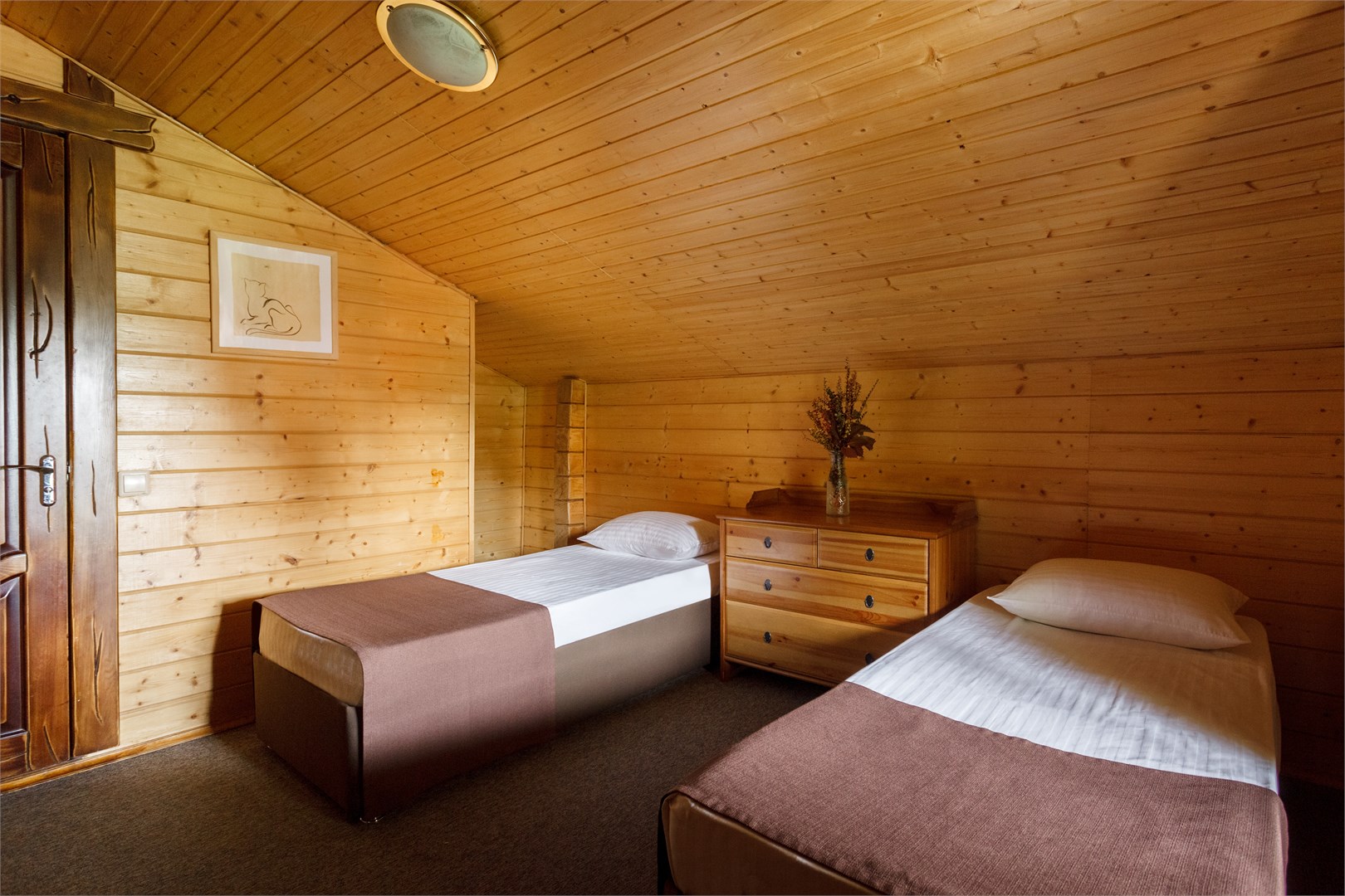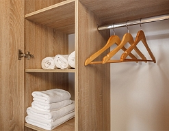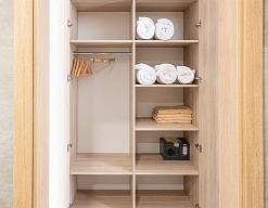 вешалка, кровати односпальные, кровать двуспальная, прикроватные тумбочки, стол, стулья, шкаф