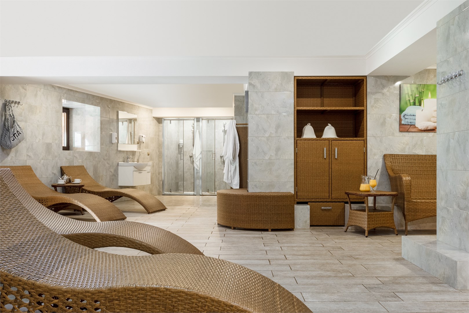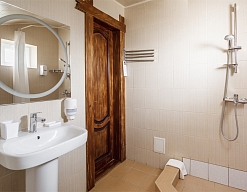 с душевой кабиной, туалетные принадлежности, фен