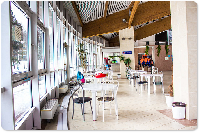На территории работает несколько точек питания с общей посадкой до 600 человек. Комплексное меню организовано в столовой. В корпусе 3 находится кафе «Алтын», где можно отведать блюда башкирской кухни. В оригинальном альпийском стиле оформлен ресторан РК «Non Stop» вместимостью до 150 мест. Кафе-бары предусмотрены в РК на 2 этаже, в зоне танцпола, и в аквапарке.