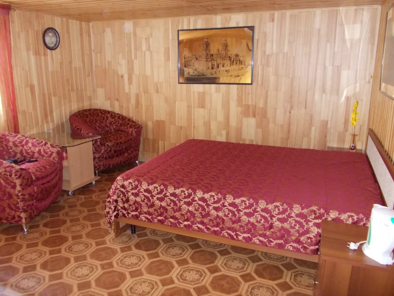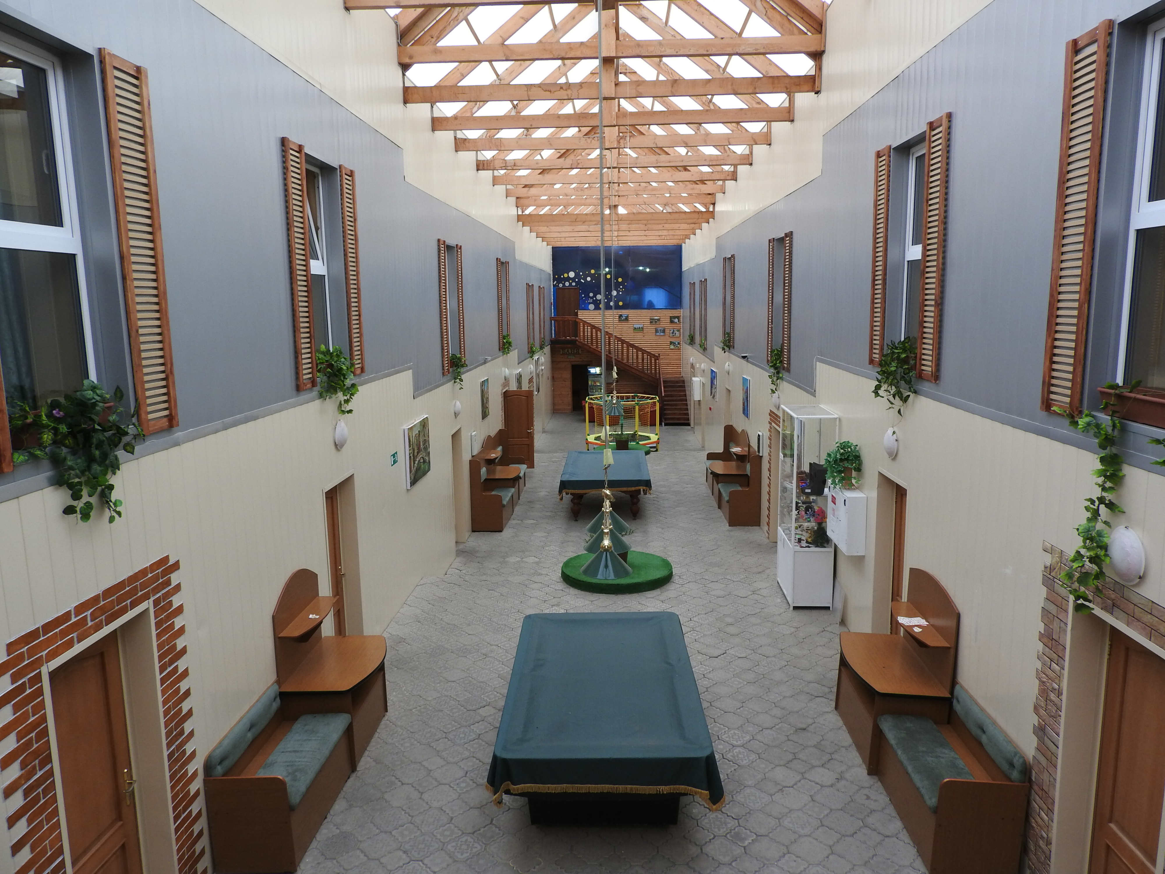 Территория гостиницы занимает небольшую, компактно организованную площадь, в жилом секторе поселка. Внешне неприметный, отель отличается оригинальной внутренней архитектурой. В главном корпусе жилая часть разделена на две «улицы», между которыми проходит импровизированный дворик с бильярдными столами, зонами отдыха и детским батутом. Всего для размещения предусмотрено 3 корпуса: 2-этажный основной, 2-ой дополнительный, и 2-комнатный бунгало с отдельным входом. В первом корпусе расположено 12 двухуровневых номеров, часть их них – после ремонта. Обновлена мебель, техника, текстиль. Номера оборудованы душевыми, санузлами, телевизорами, Wi-Fi, холодильниками, чайниками и чайными наборами посуды. В холле установлена микроволновая печь, в номерах с ремонтом она индивидуальная. Часть номеров оснащена полноценными кухонными зонами с электрической плитой и посудой. Корпус бунгало выполнен из натурального дерева, в санузлах подключены теплые полы.