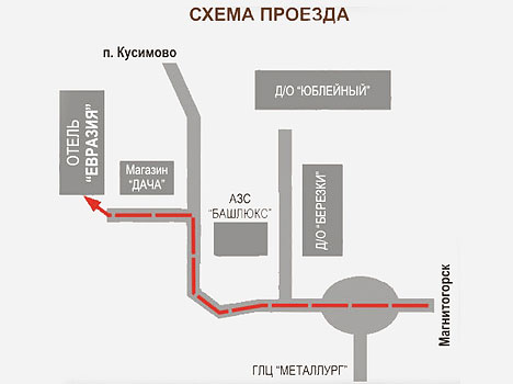 Гостиница «Евразия» находится в 2 мин. езды от ГЛЦ «Металлург-Магнитогорск», поворот с дороги между большим зеленым магазином “Ситно" и столовой "Тарелка" - прямо 100 метров.