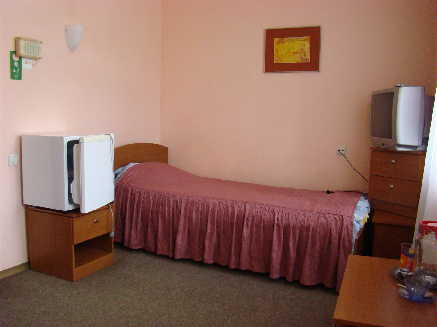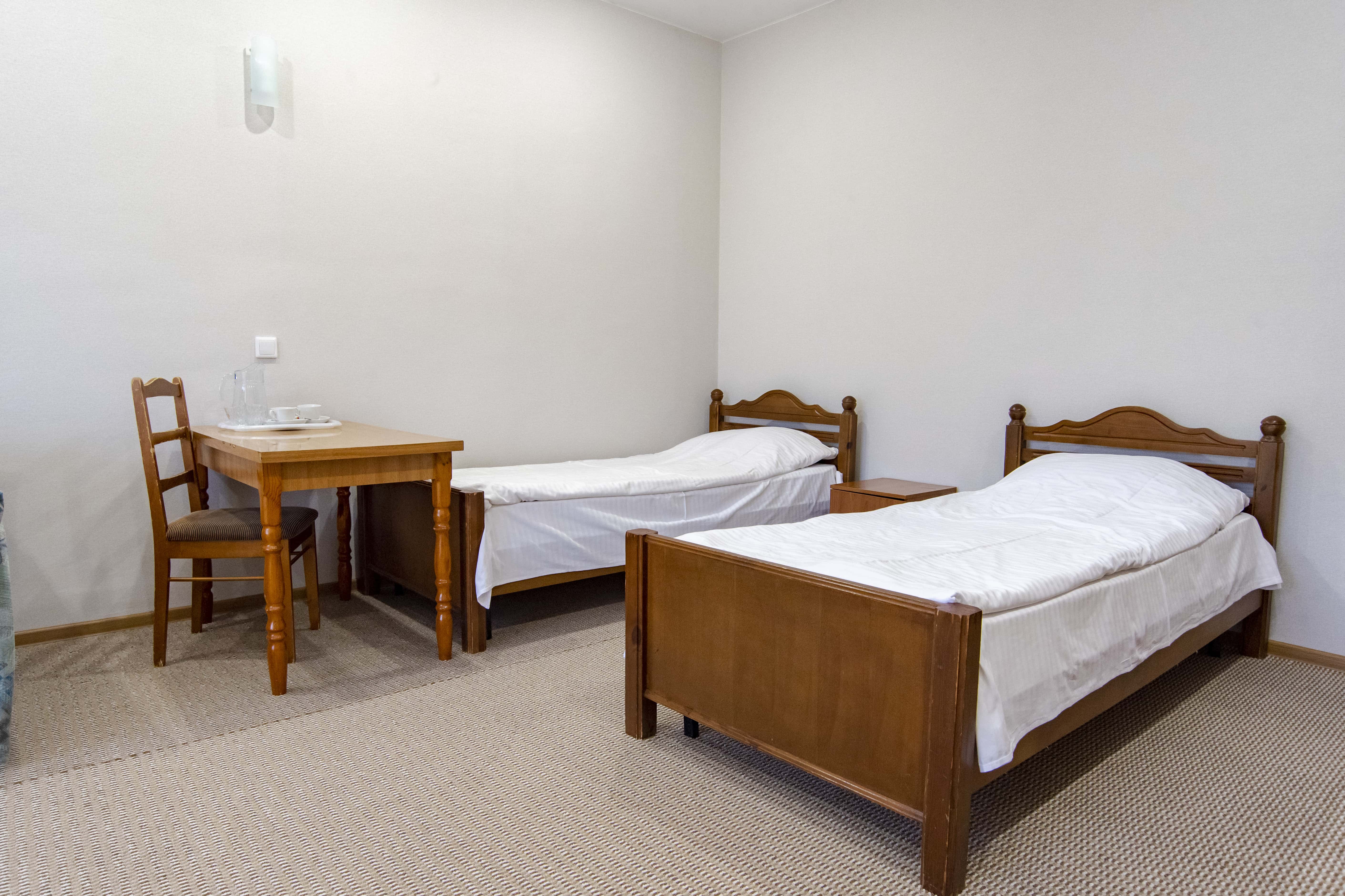 вешалка, кровати односпальные, прикроватные тумбочки, стол, стул, шкаф