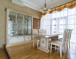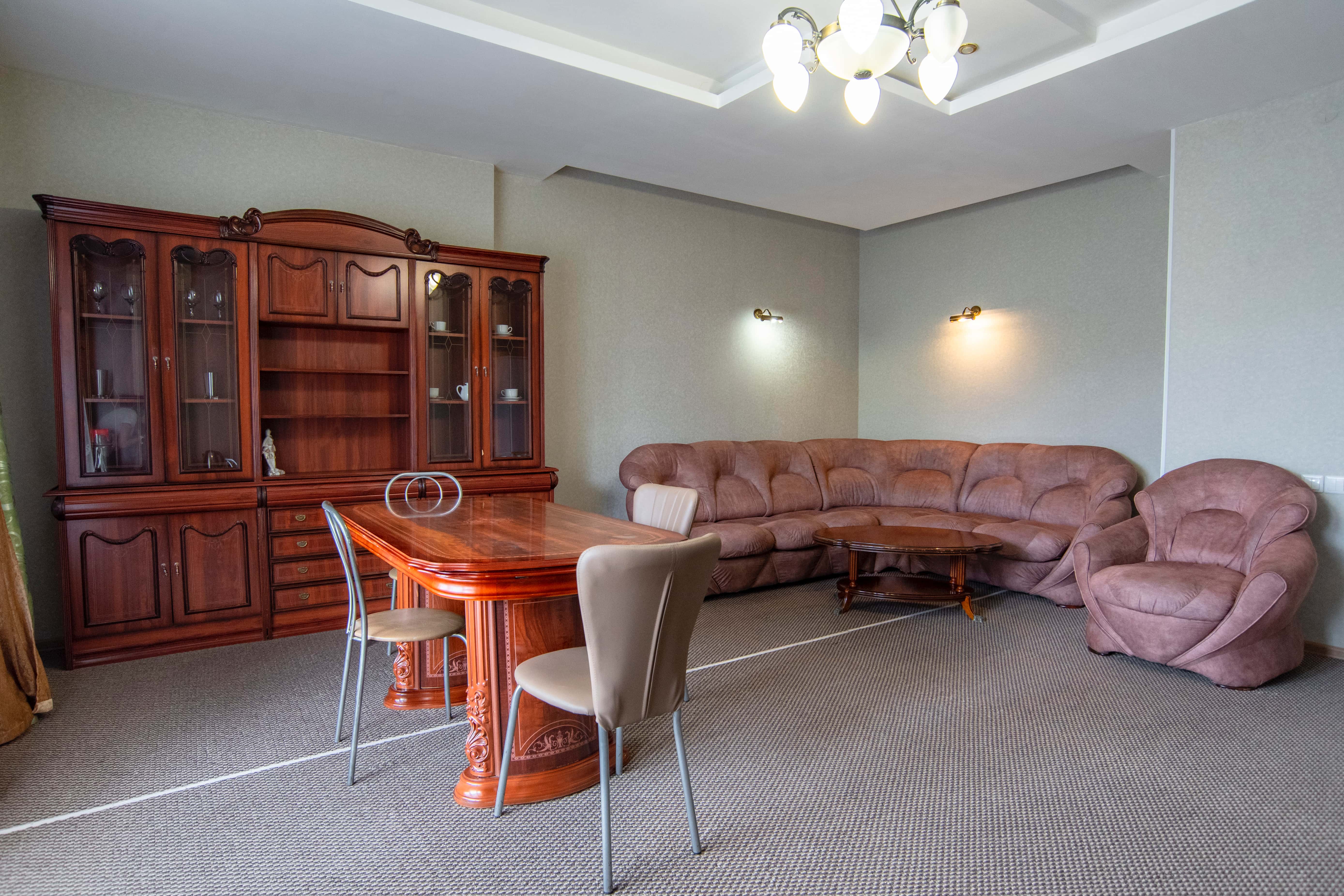вешалка, диван раскладной, зеркало, комод, кресла, кровать двуспальная, прикроватные тумбочки, стол, столик журнальный, стулья, шкаф, шкаф для посуды