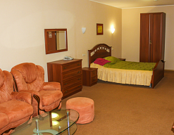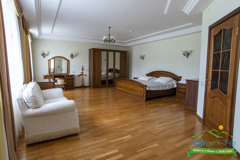 кресла, кровать двуспальная, прикроватные тумбочки, столик журнальный, столик туалетный, стул, тумба багажная, шкаф