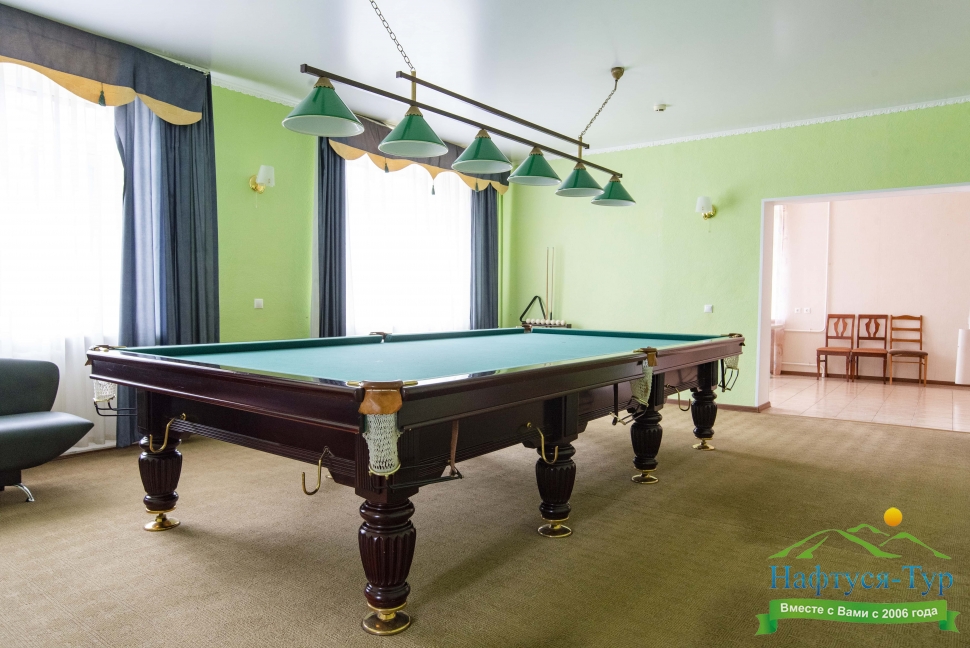 бильярд, камин, телевизор, холодильник, чайный набор посуды, электрочайник