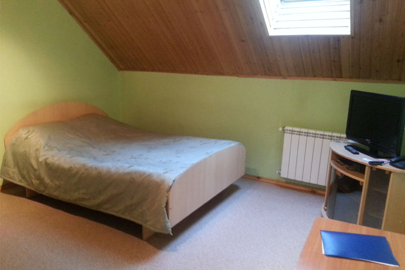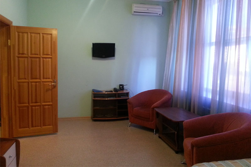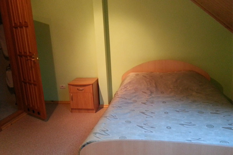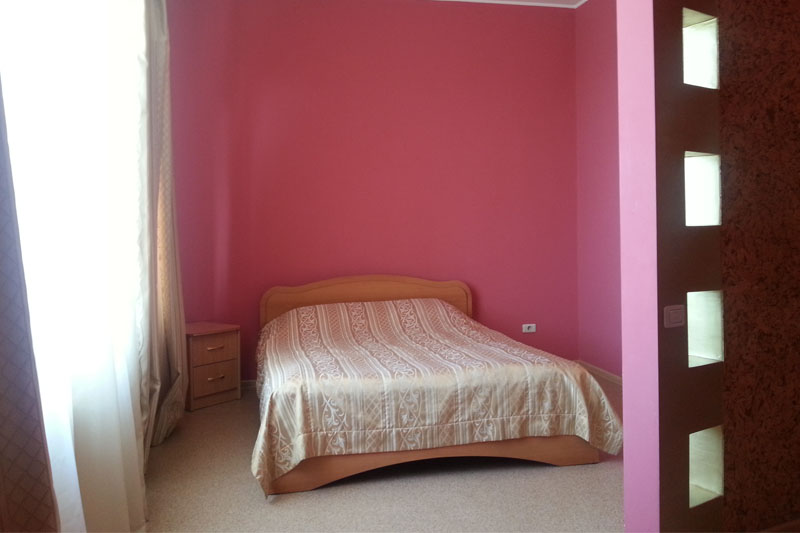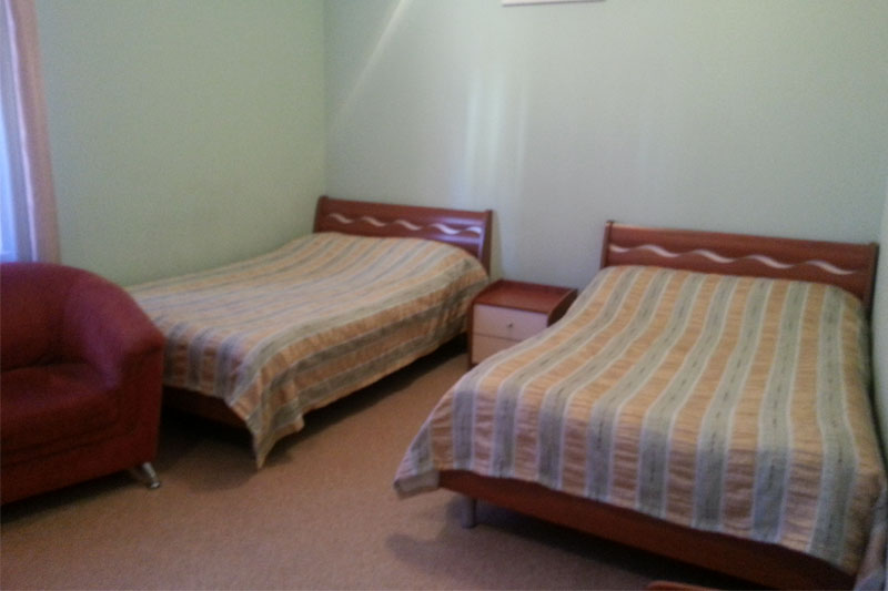 Приметное 2-этажное здание гостиницы с красной крышей видно издалека. Комплекс расположен на просторной улице, в окружении жилых домов, с большой парковкой. К услугам гостей 12 благоустроенных номеров. В каждом из них: телевизор, кондиционер, телефон, халат, тапочки, Wi-Fi, набор посуды и гигиенических принадлежностей. Холодильниками и чайниками оснащены только номера класса люкс.