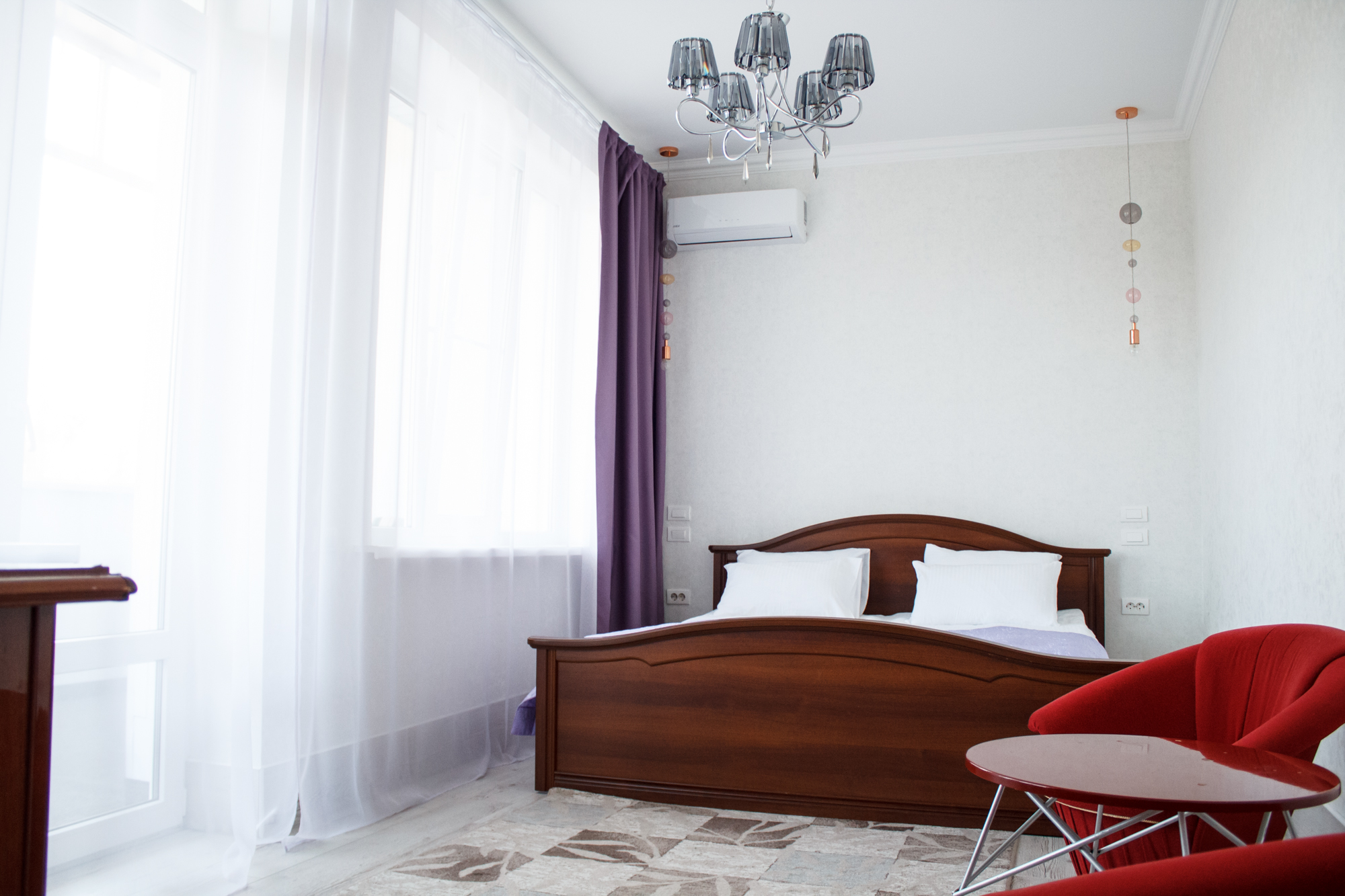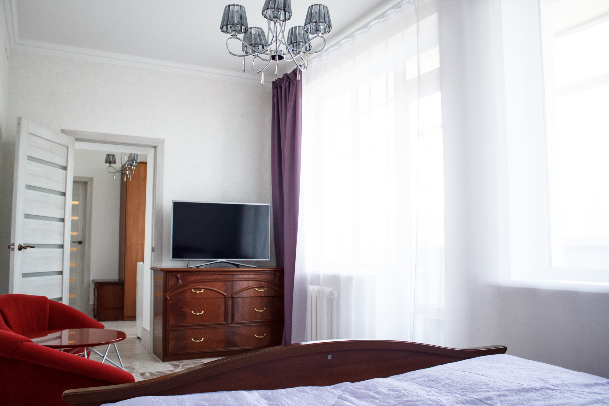 вешалка, диван, зеркало, кровать двуспальная, прикроватные тумбочки, стол, стулья, шкаф