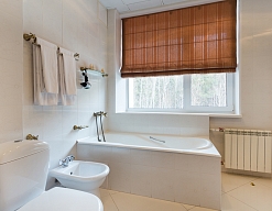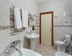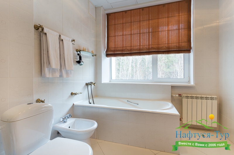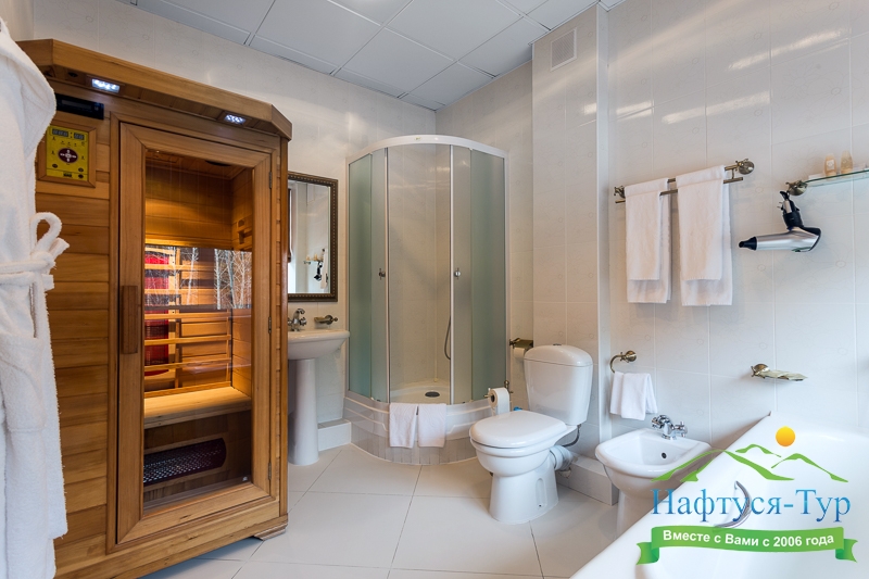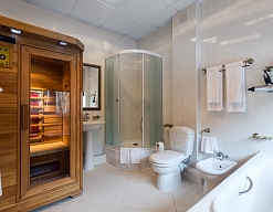 биде, сауна, с ванной и душевой кабиной, тапочки, туалетные принадлежности, фен, халат