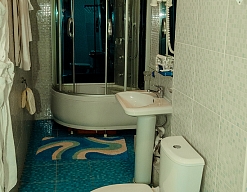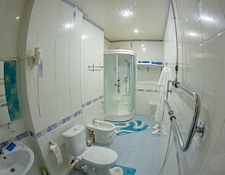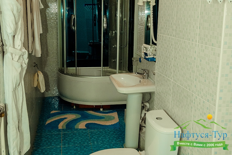 с душевой кабиной, тапочки, туалетные принадлежности, фен, халат