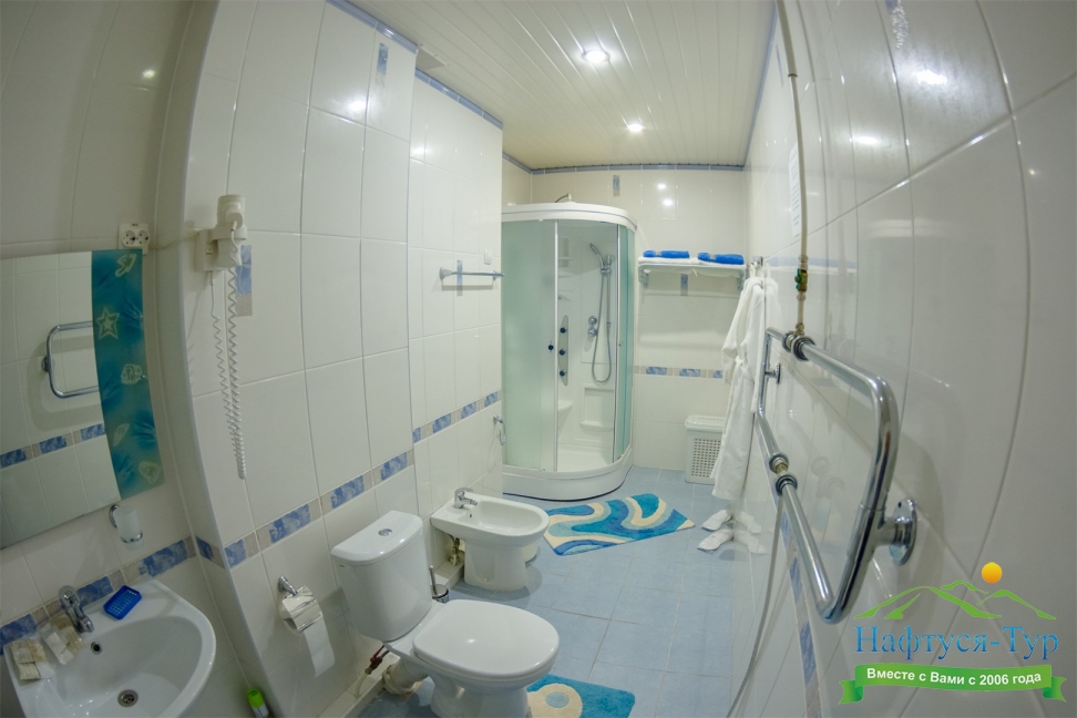 биде, с душевой кабиной, туалетные принадлежности, фен