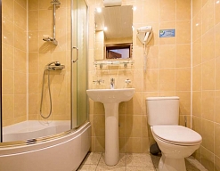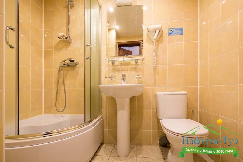 с душевой кабиной, тапочки, туалетные принадлежности, фен