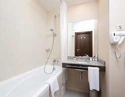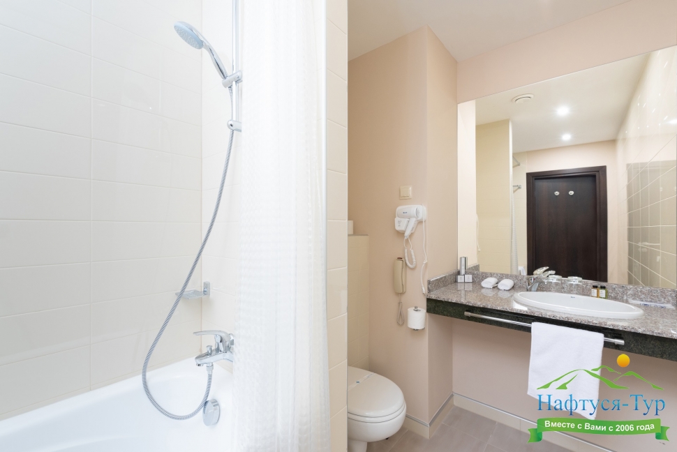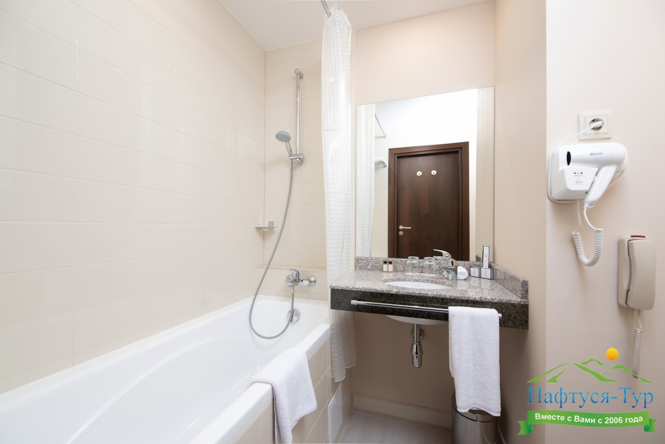 с ванной, тапочки, туалетные принадлежности, фен, халат