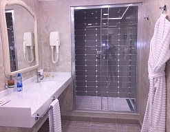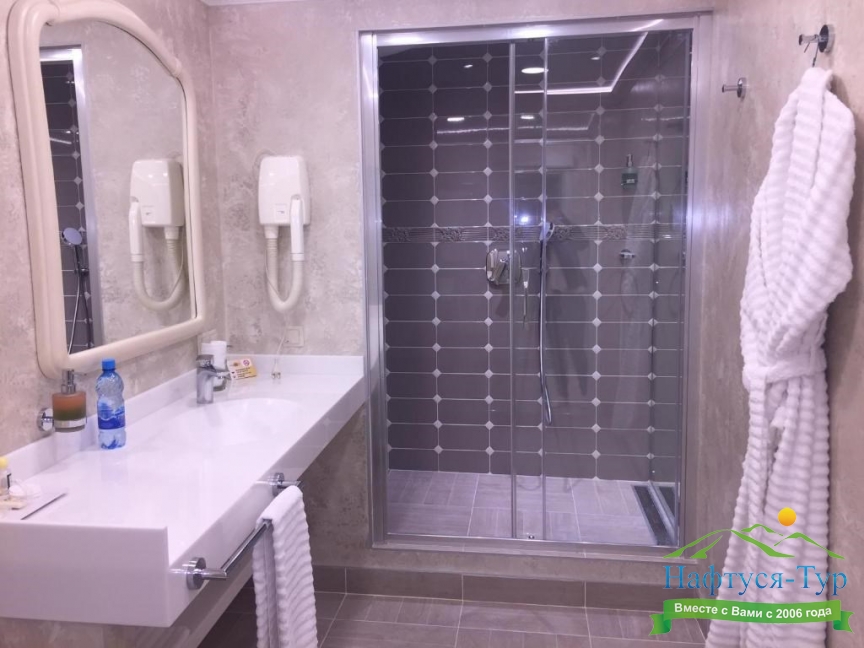 с душевой кабиной, тапочки, туалетные принадлежности, фен, халат