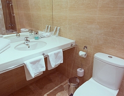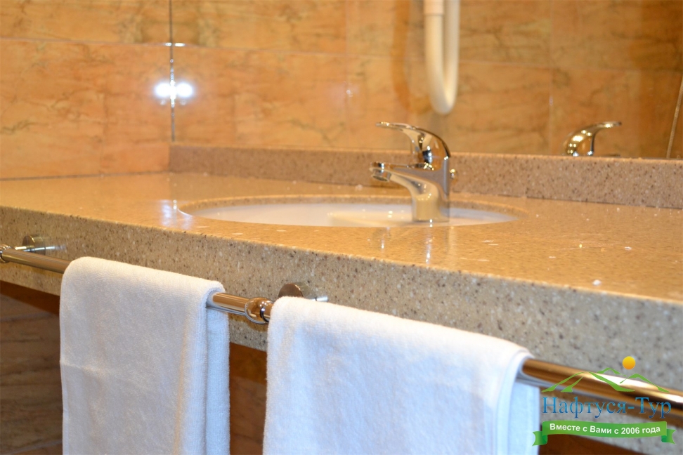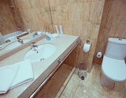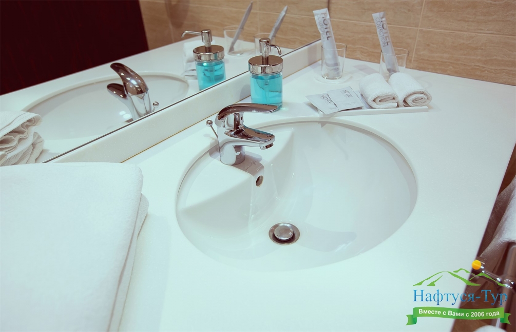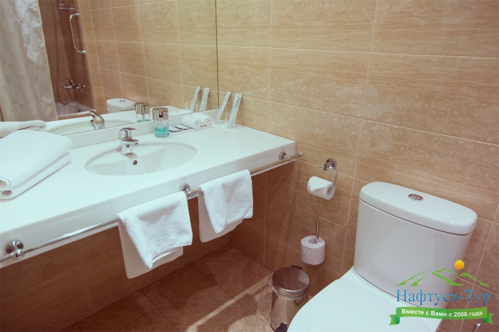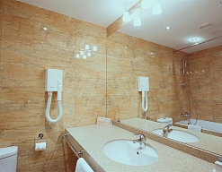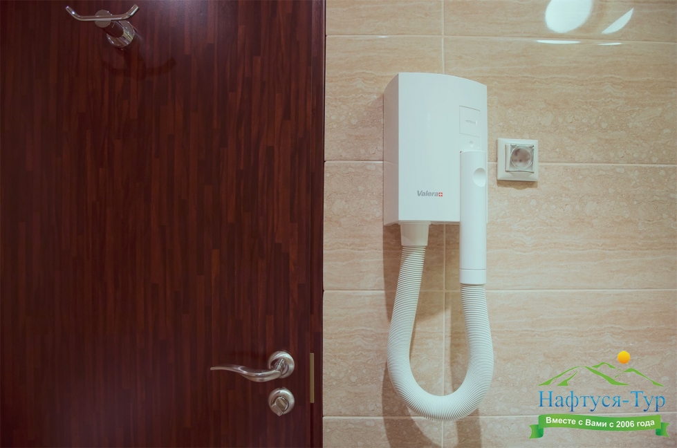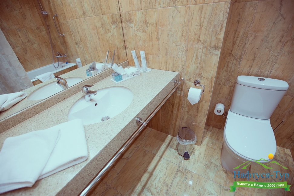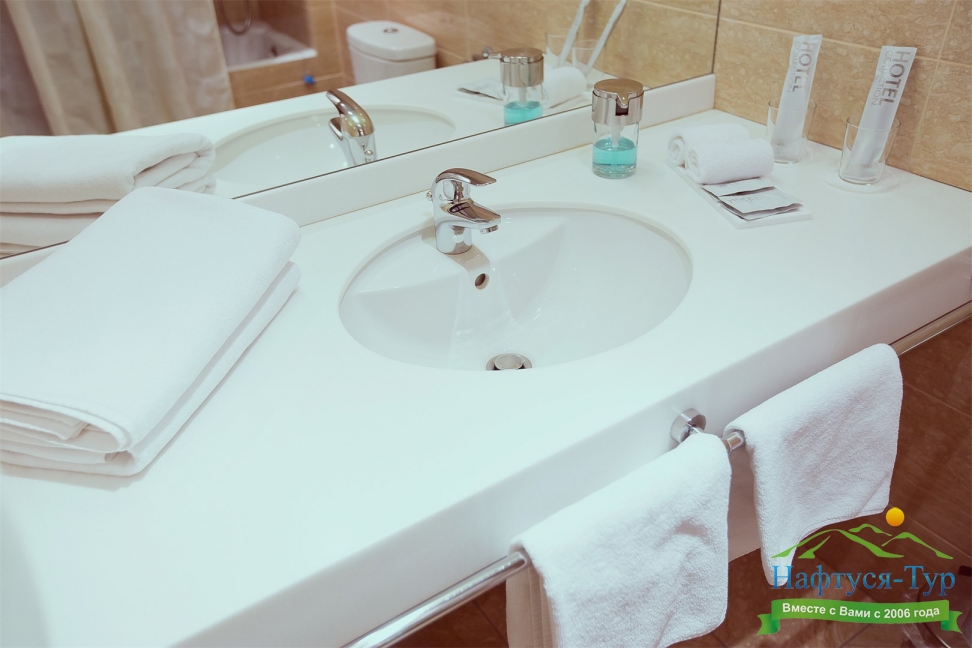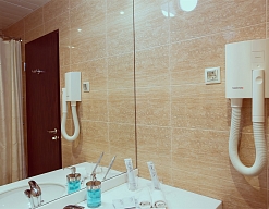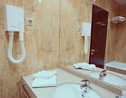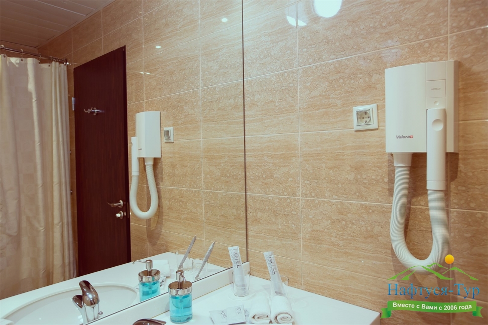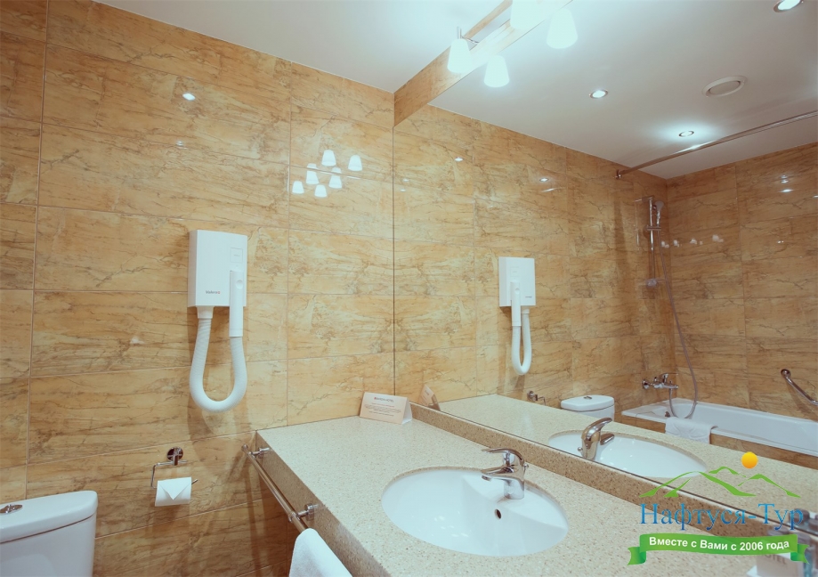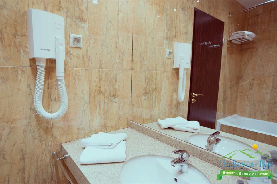 с ванной, тапочки, туалетные принадлежности, фен, халат
