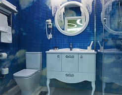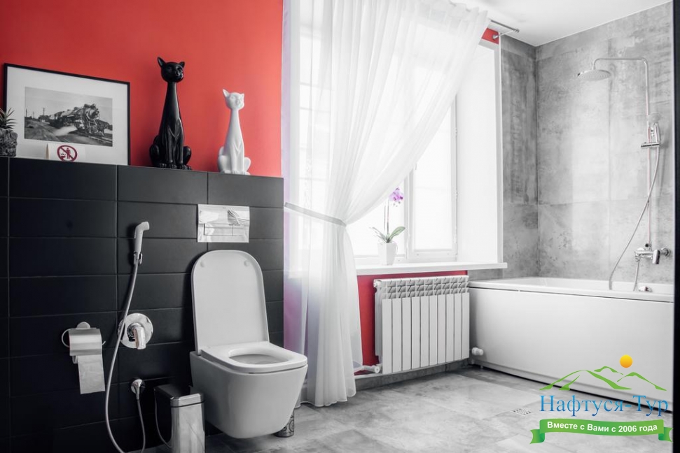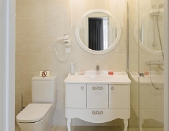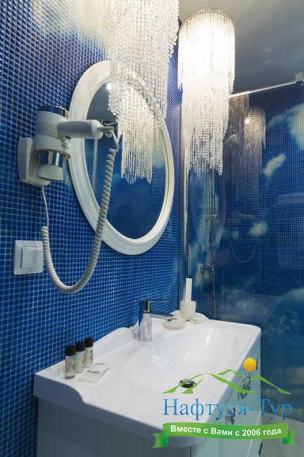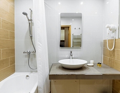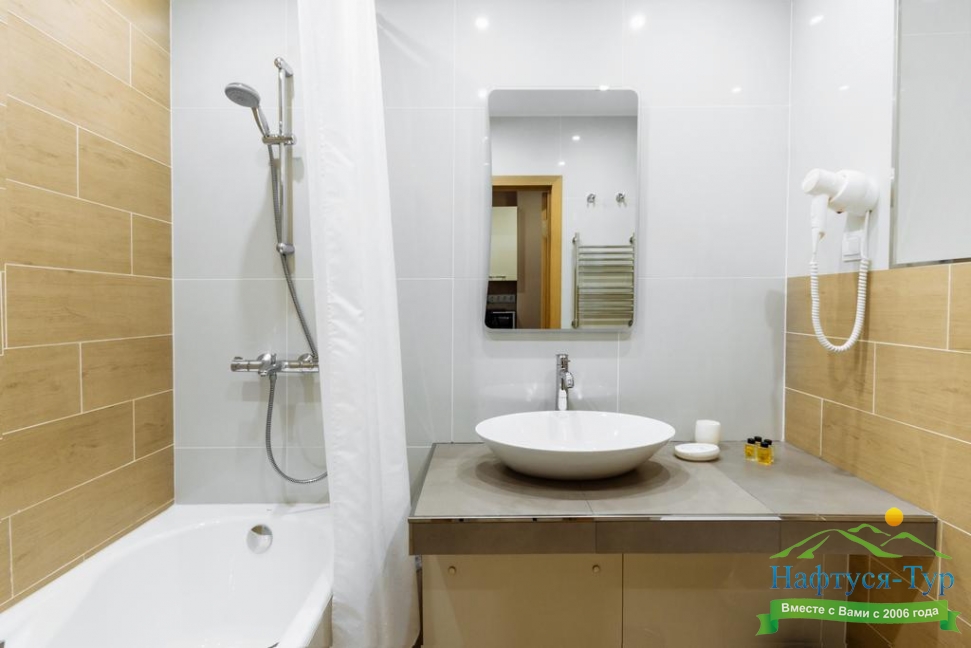 с ванной, тапочки, туалетные принадлежности, фен, халат