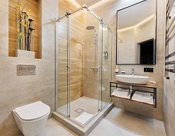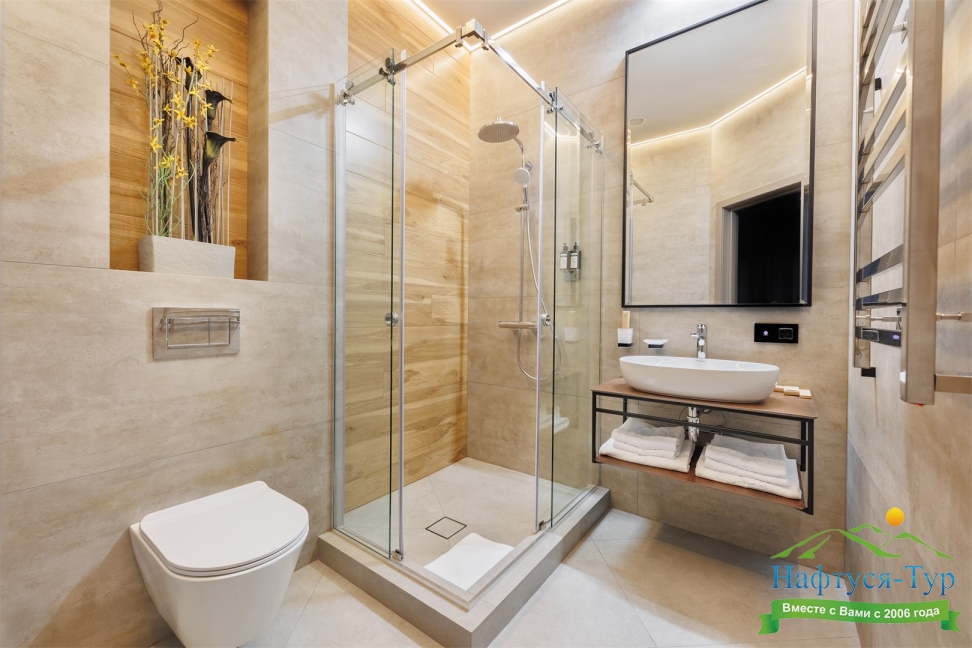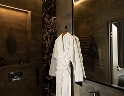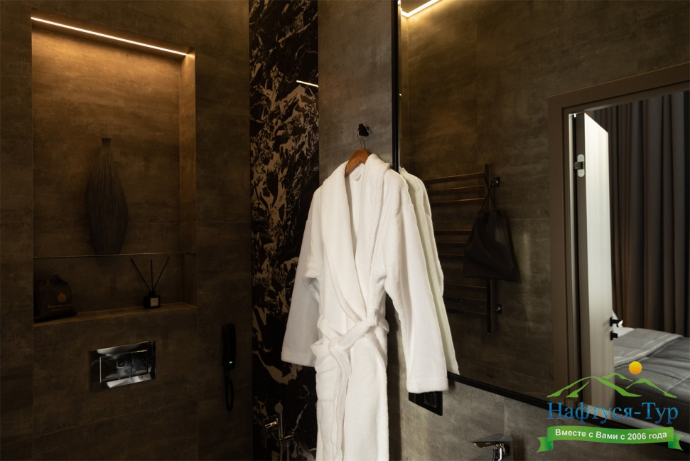 с душем, тапочки, туалетные принадлежности, фен, халат