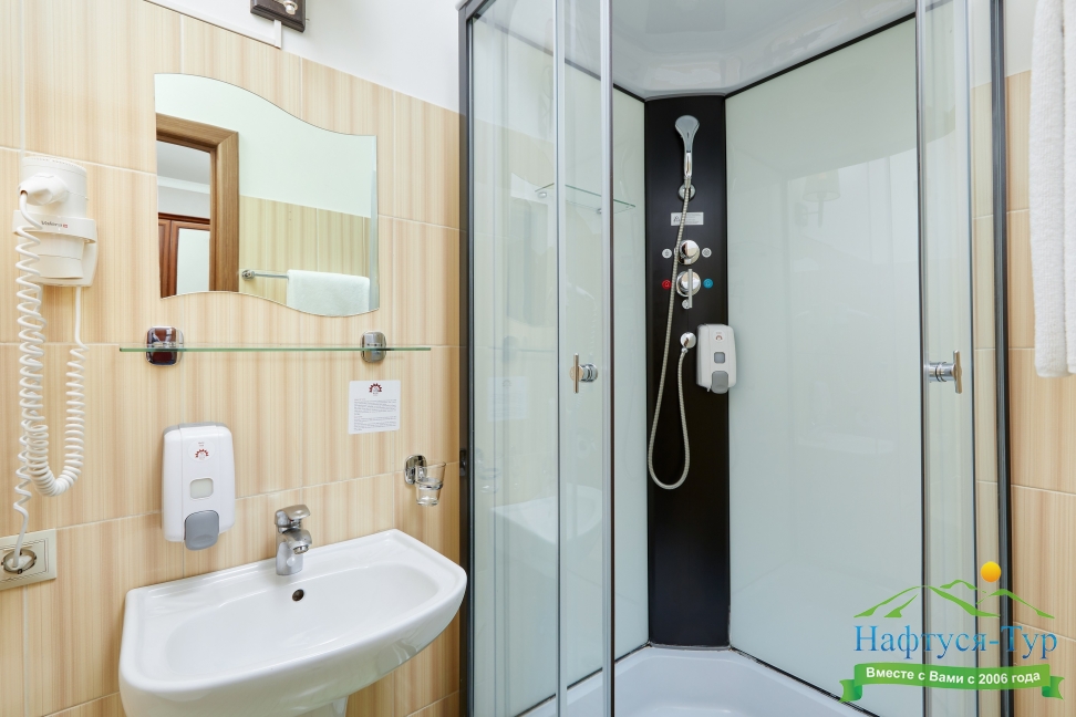 с душевой кабиной, тапочки, туалетные принадлежности, фен, халат