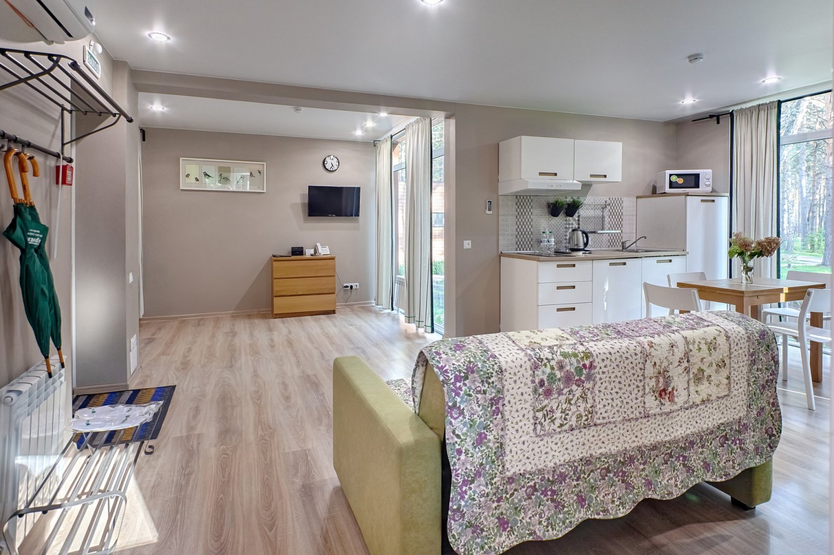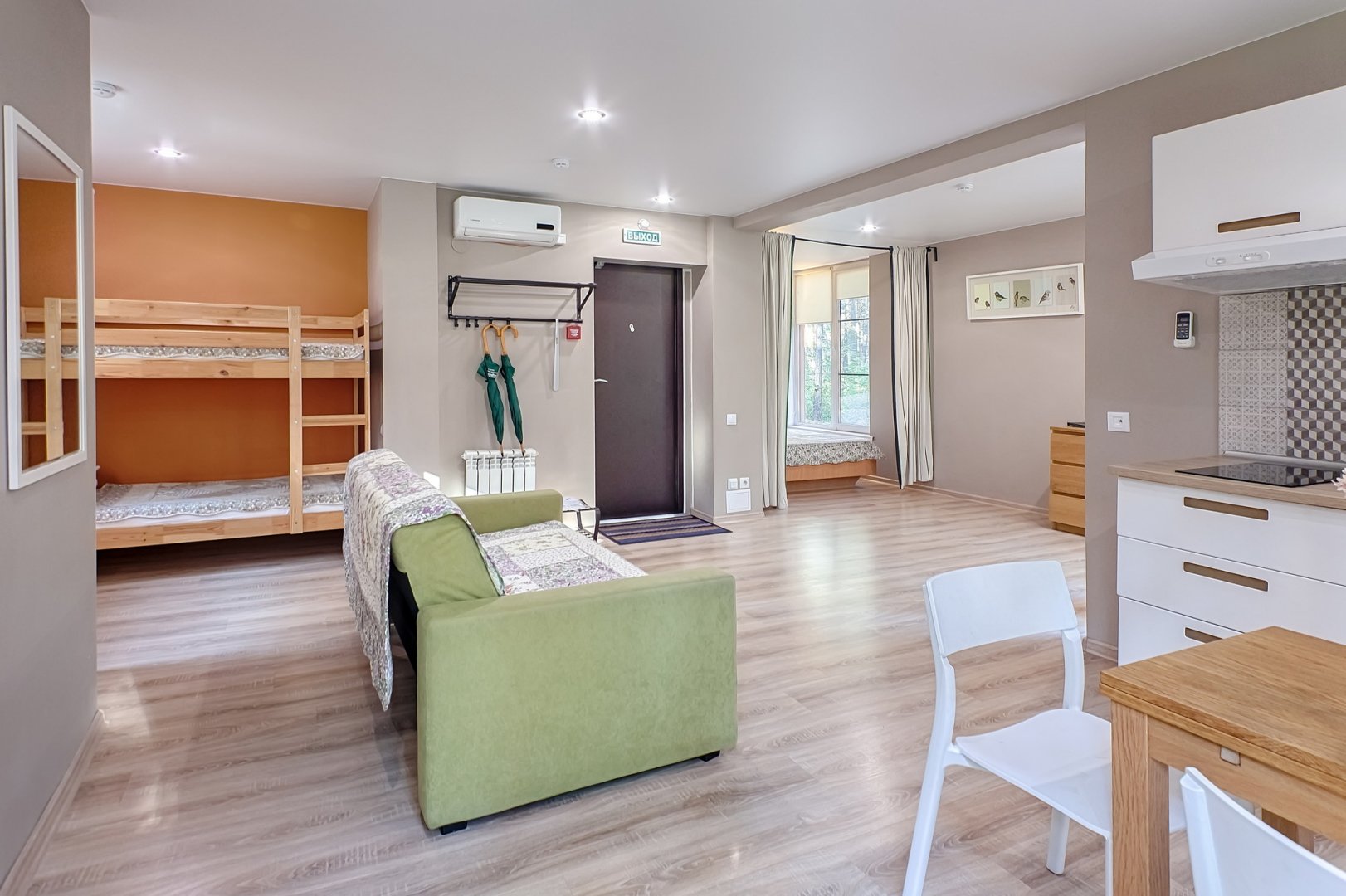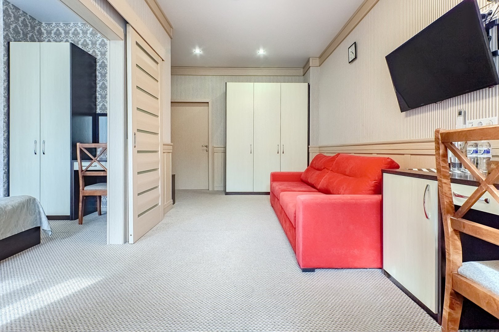 вешалка, диван раскладной, зеркало, кровать двуспальная, набор мягкой мебели, прикроватные тумбочки, стол, стулья, шкаф встроенный