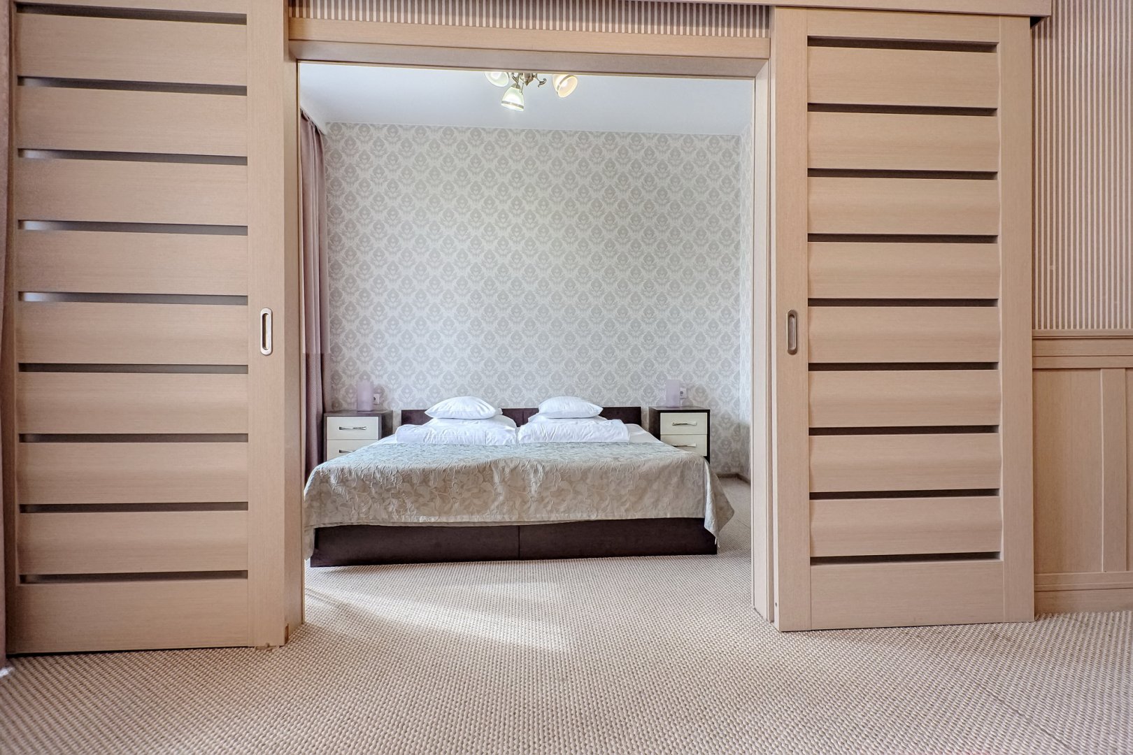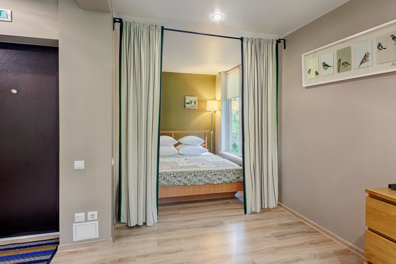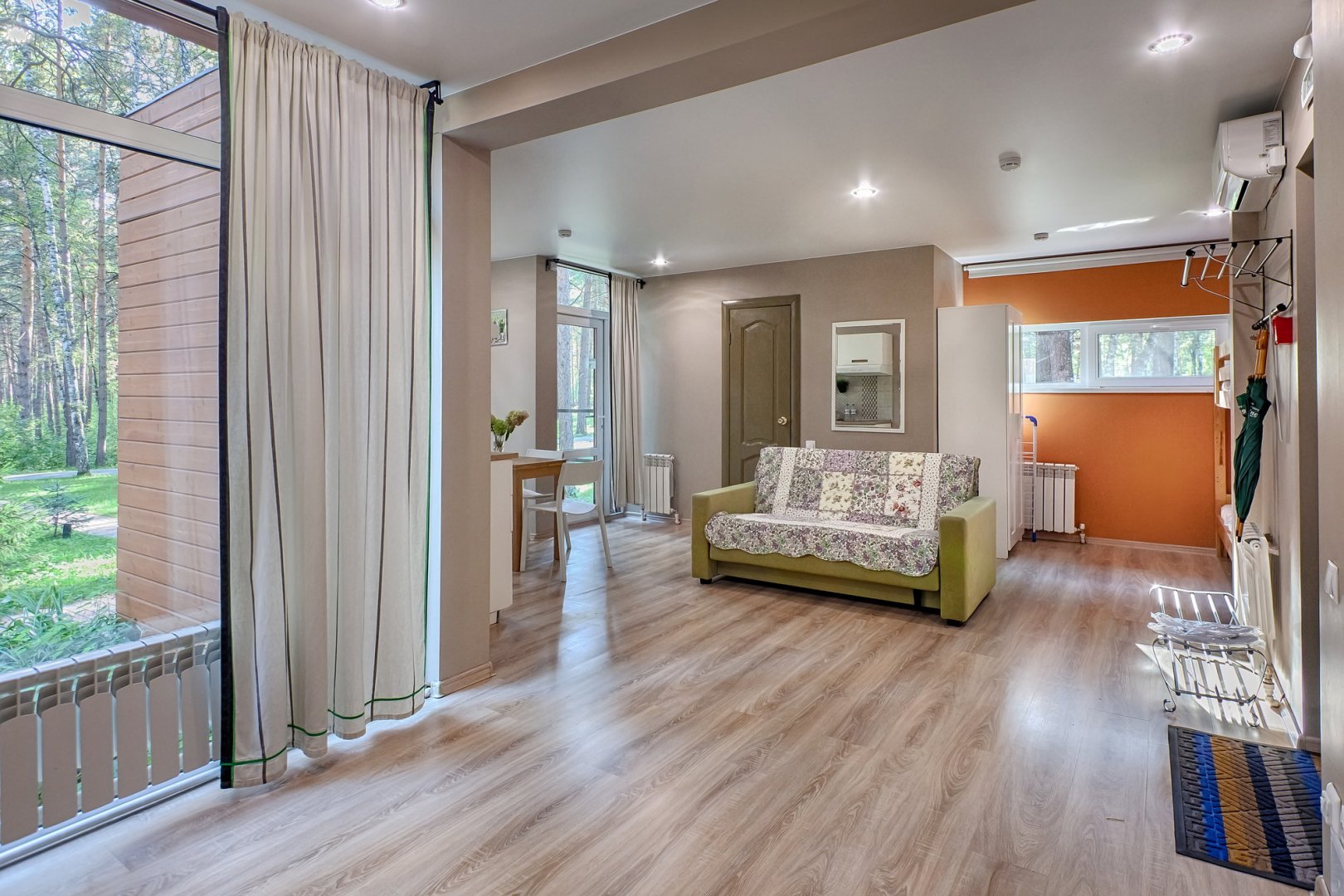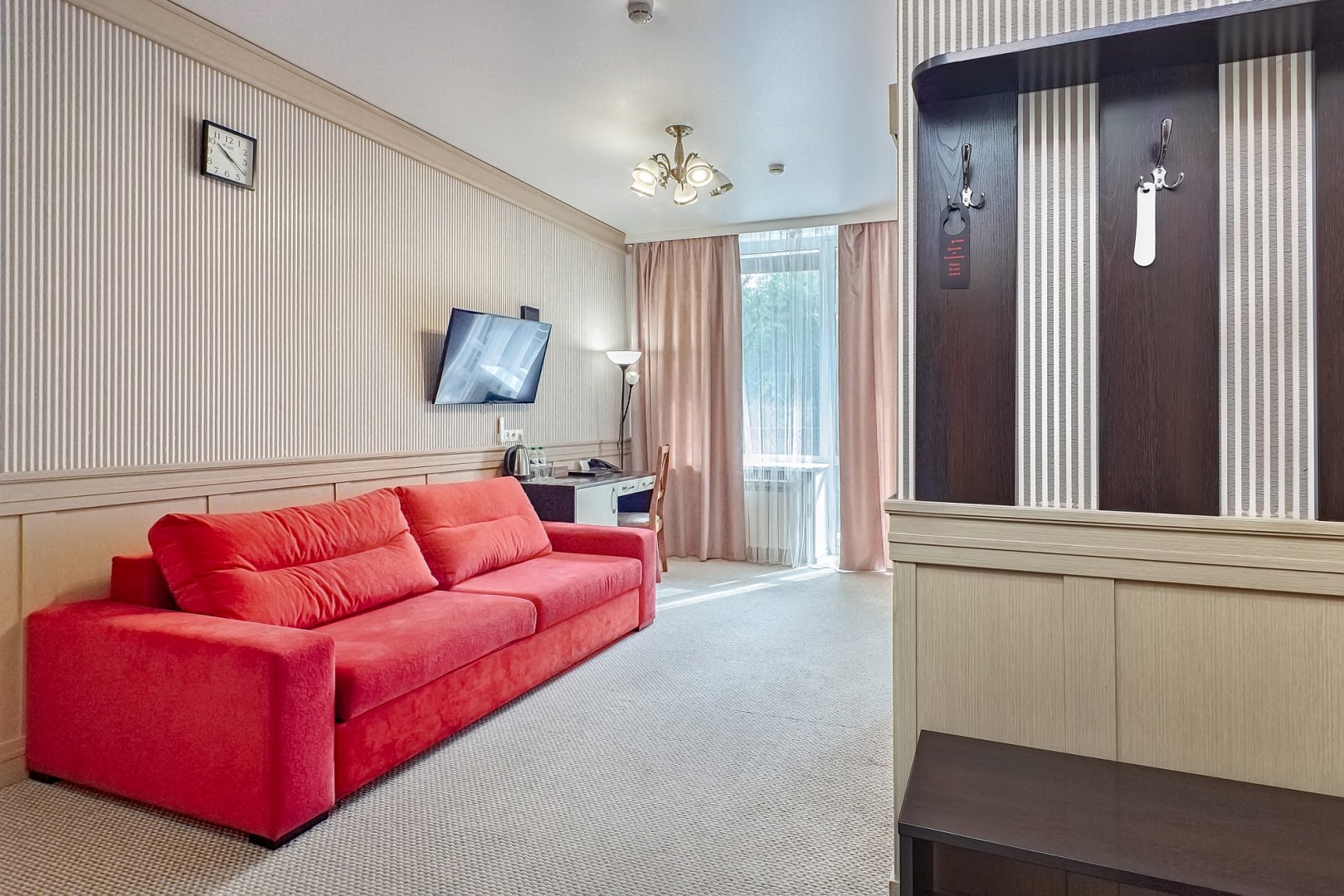 вешалка, диван раскладной, зеркало, кровать двуспальная, набор мягкой мебели, прикроватные тумбочки, стол, стулья, шкаф встроенный