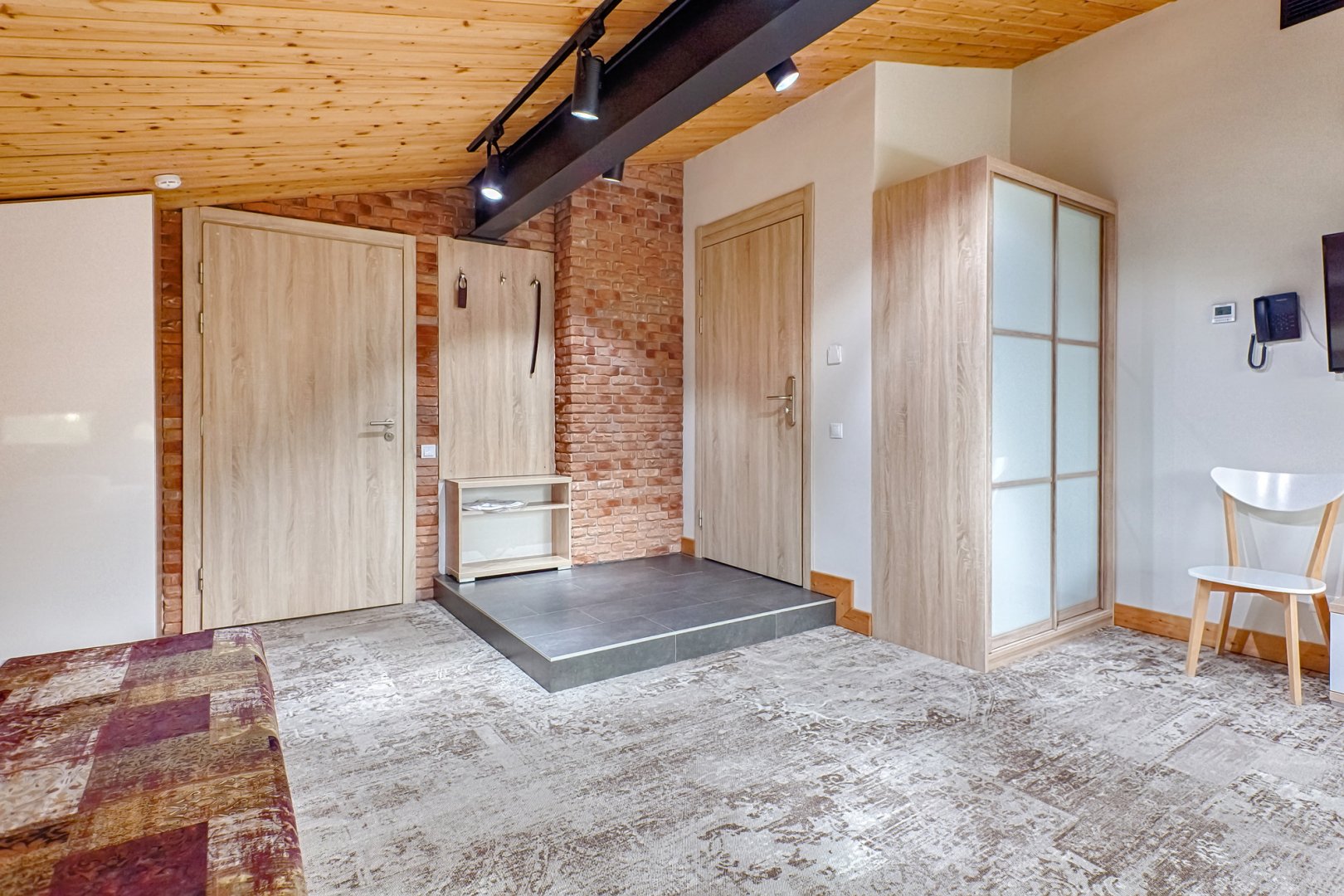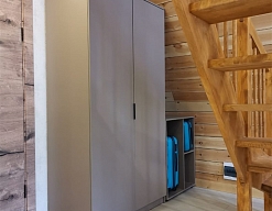 вешалка, зеркало, кровать односпальная, прикроватные тумбочки, стол, стул, шкаф встроенный