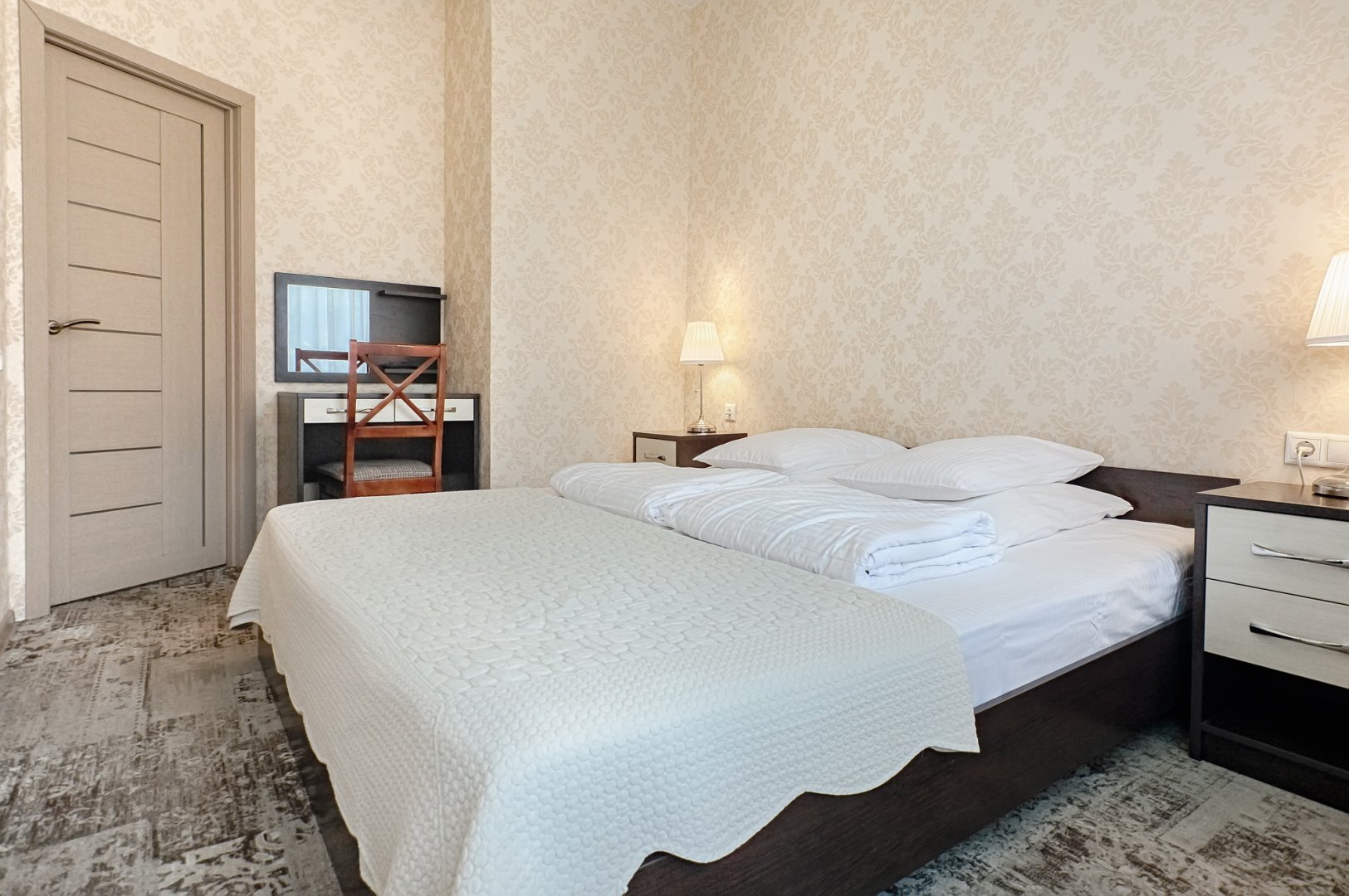 диван раскладной, зеркало, кресло, кровать двуспальная, прикроватные тумбочки, столик журнальный, столик туалетный, стулья