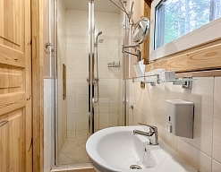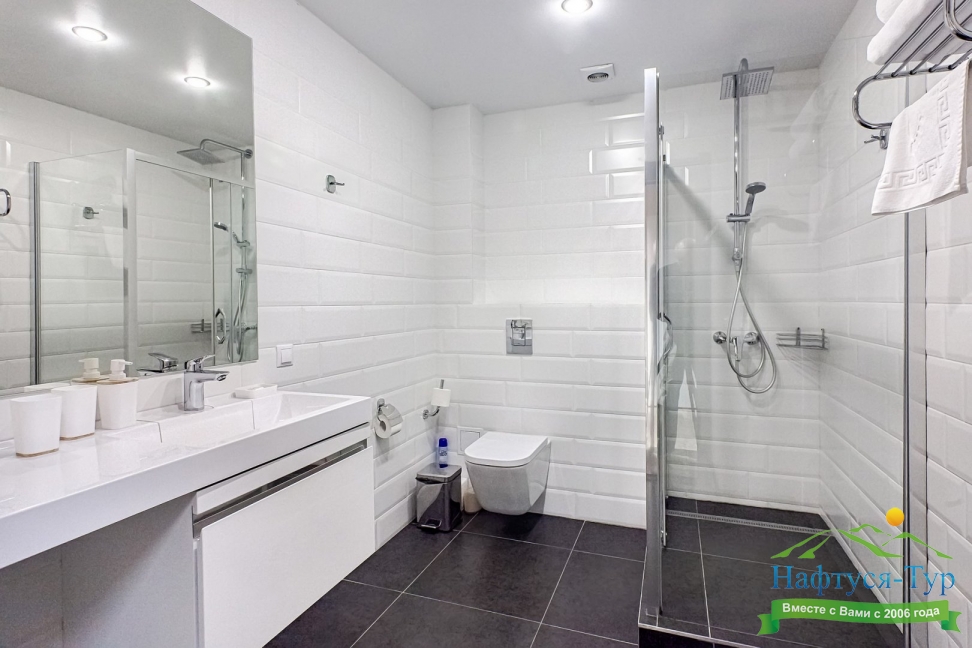 с душевой кабиной, тапочки, туалетные принадлежности, фен, халат