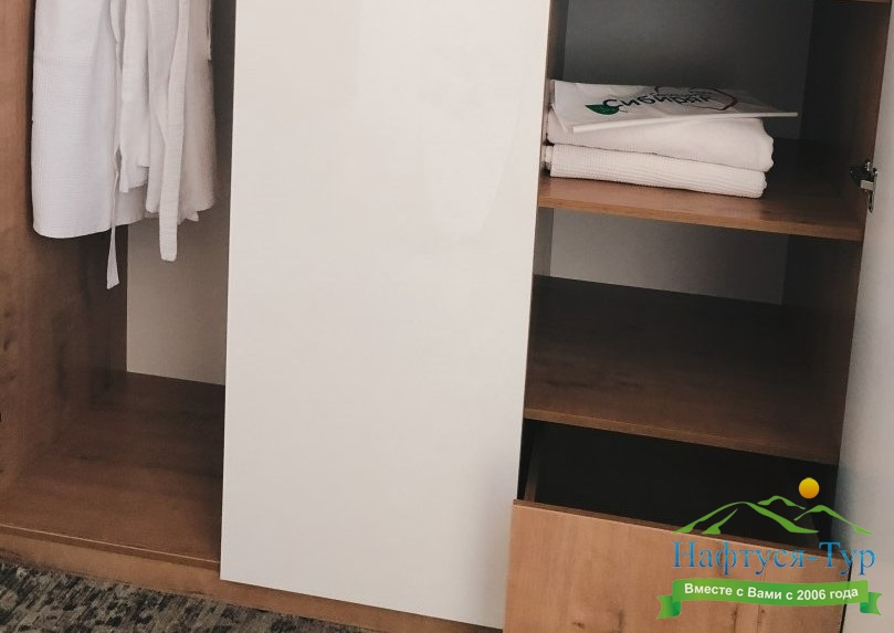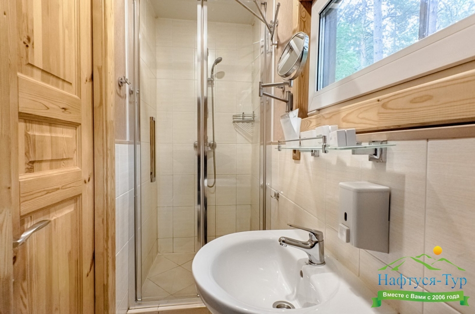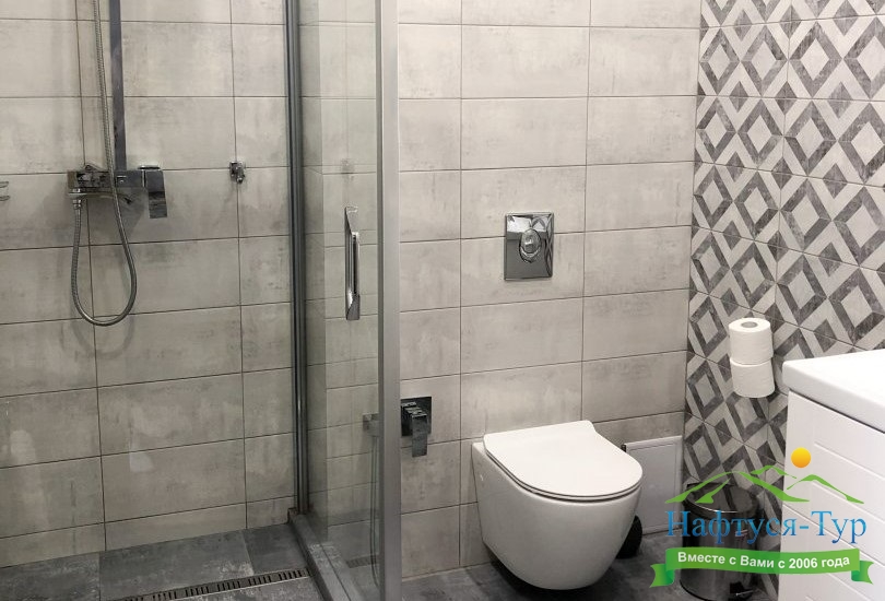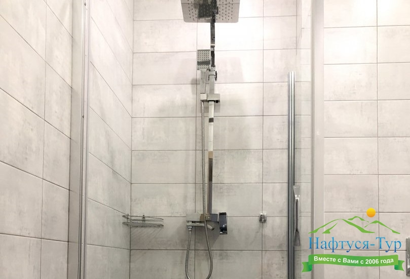 с душевой кабиной, тапочки, фен, халат