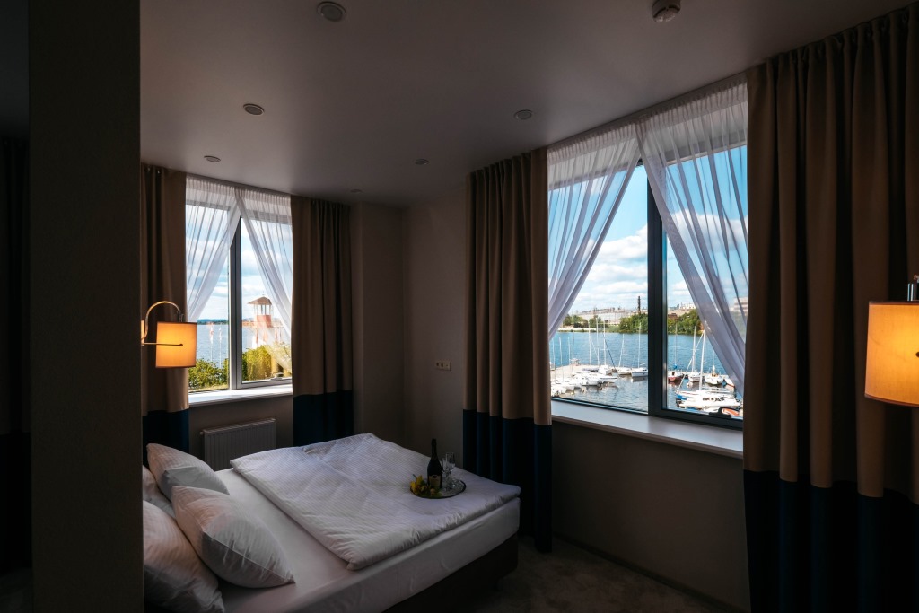 Завтрак по шведской линии предоставляется в кафе «Крюк» на 2 этаже отеля. Здесь же можно пообедать по меню бизнес-ланча или поужинать по основному меню. На 1 этаже работает кают-компания «Бросай якорь». Здесь гостей ждет морская атмосфера, панорамные окна, богатая чайная карта и ароматный кофе.