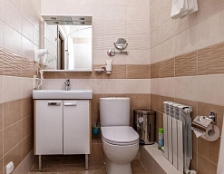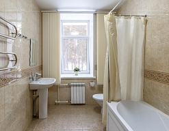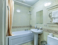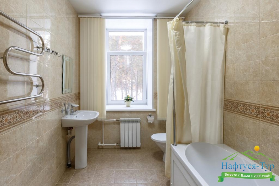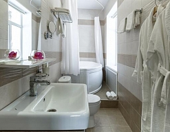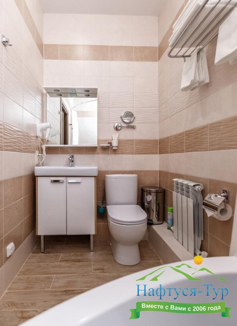 с ванной, тапочки, туалетные принадлежности, фен, халат