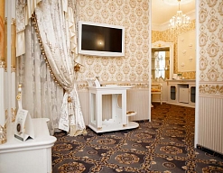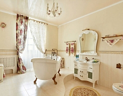 с ванной, тапочки, туалетные принадлежности, фен, халат