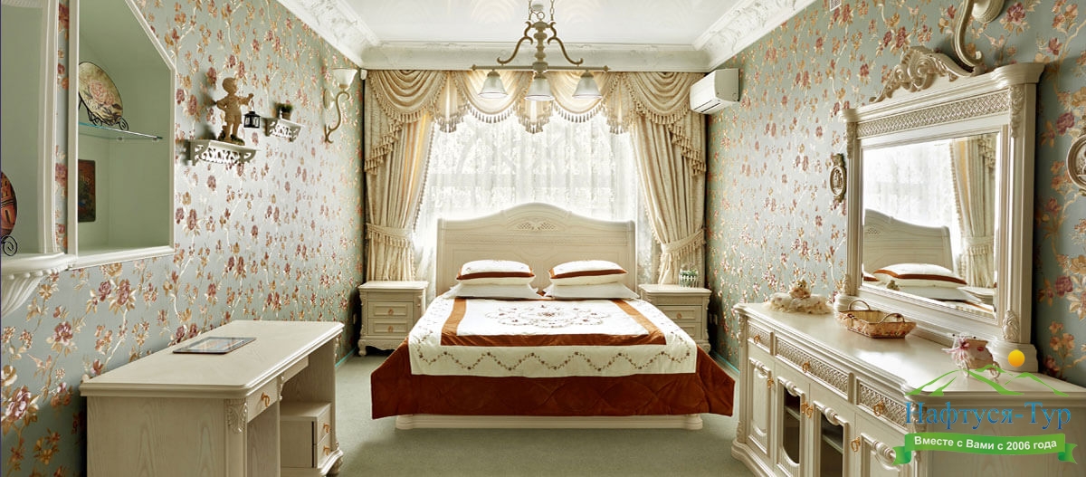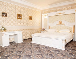 кровать двуспальная, набор мягкой мебели, прикроватные тумбочки, стол, стул, шкаф